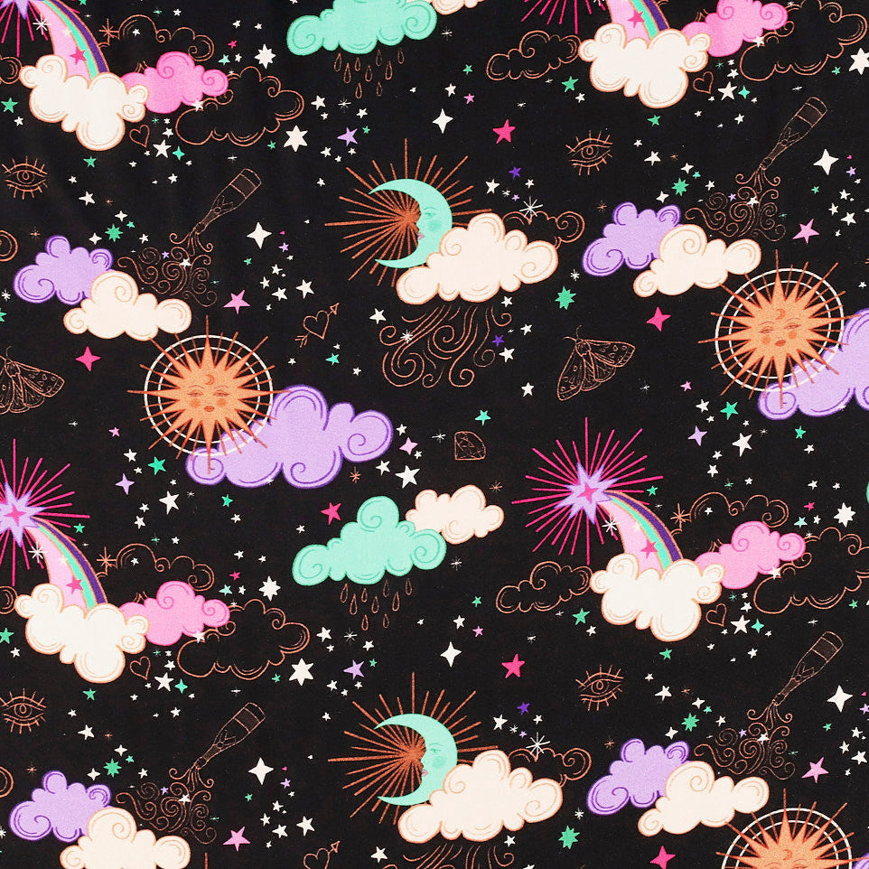 Bring some ethereal style to your garments with this bold viscose twill print from Fabric Godmother! With pops of vibrant pastel shades on a jet black background, it features a celestial design complete with exploding stars and wispy clouds, for an eye-catching and bold print.