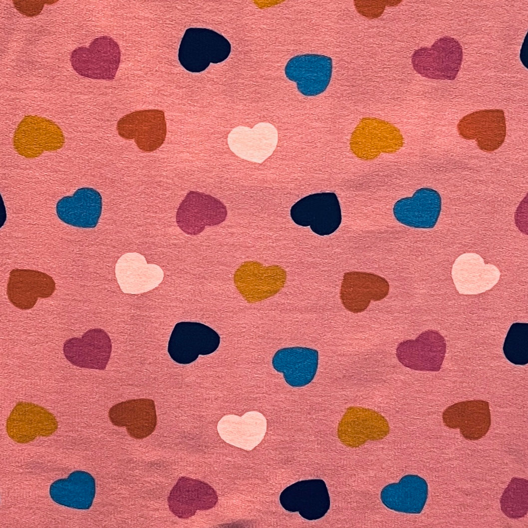 Super soft on the back for ultimate comfort, it has a lovely 2 way stretch, making it ideal for comfortable clothing like hoodies and trousers. The classic hearts print is great for kids and adults alike, with pops of colour in each heart!