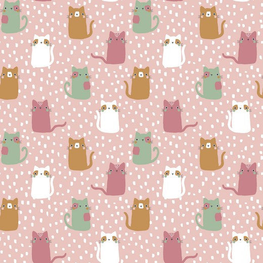 This sweatshirting is super soft on the back for ultimate comfort, and has a lovely 2 way stretch, making it ideal for comfortable clothing like hoodies and trousers. This fun animal print is full of cute and colourful cats, set on a light pink background with a subtle dot print for the ultimate cat-lovers print!