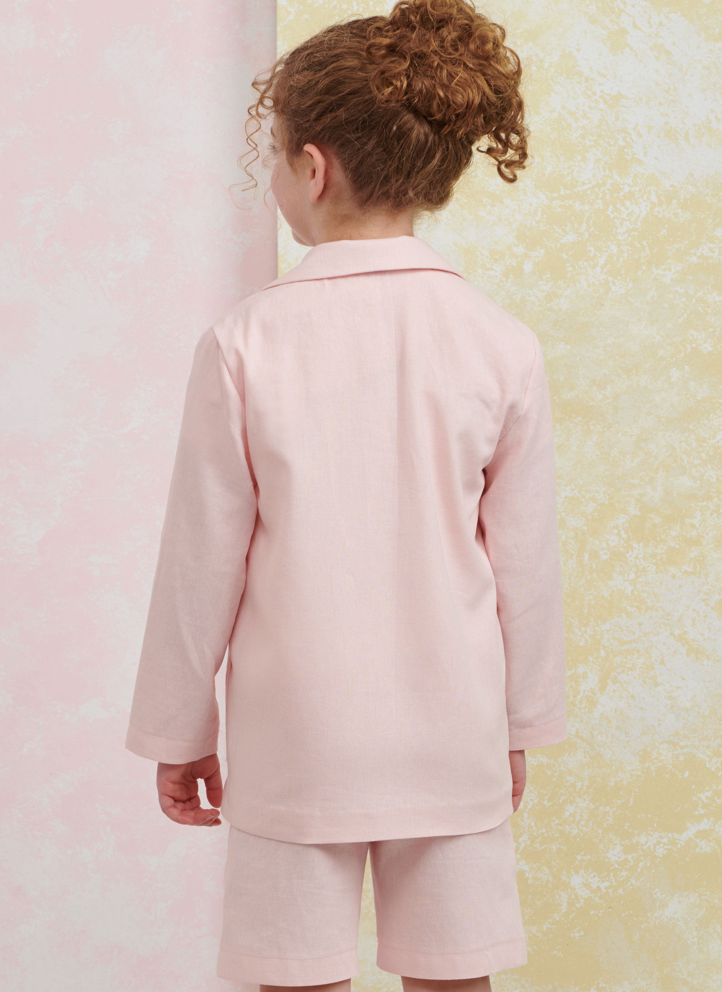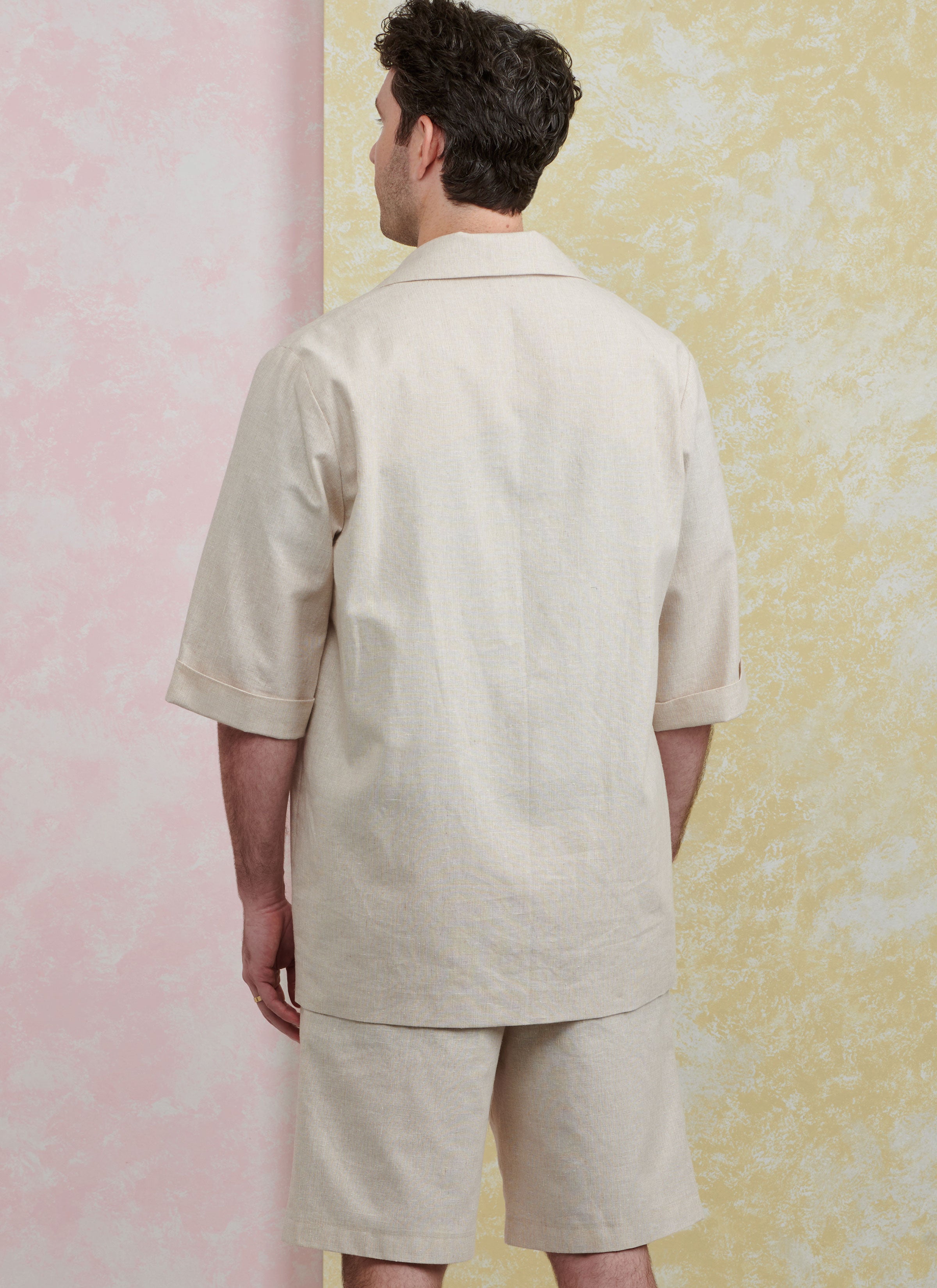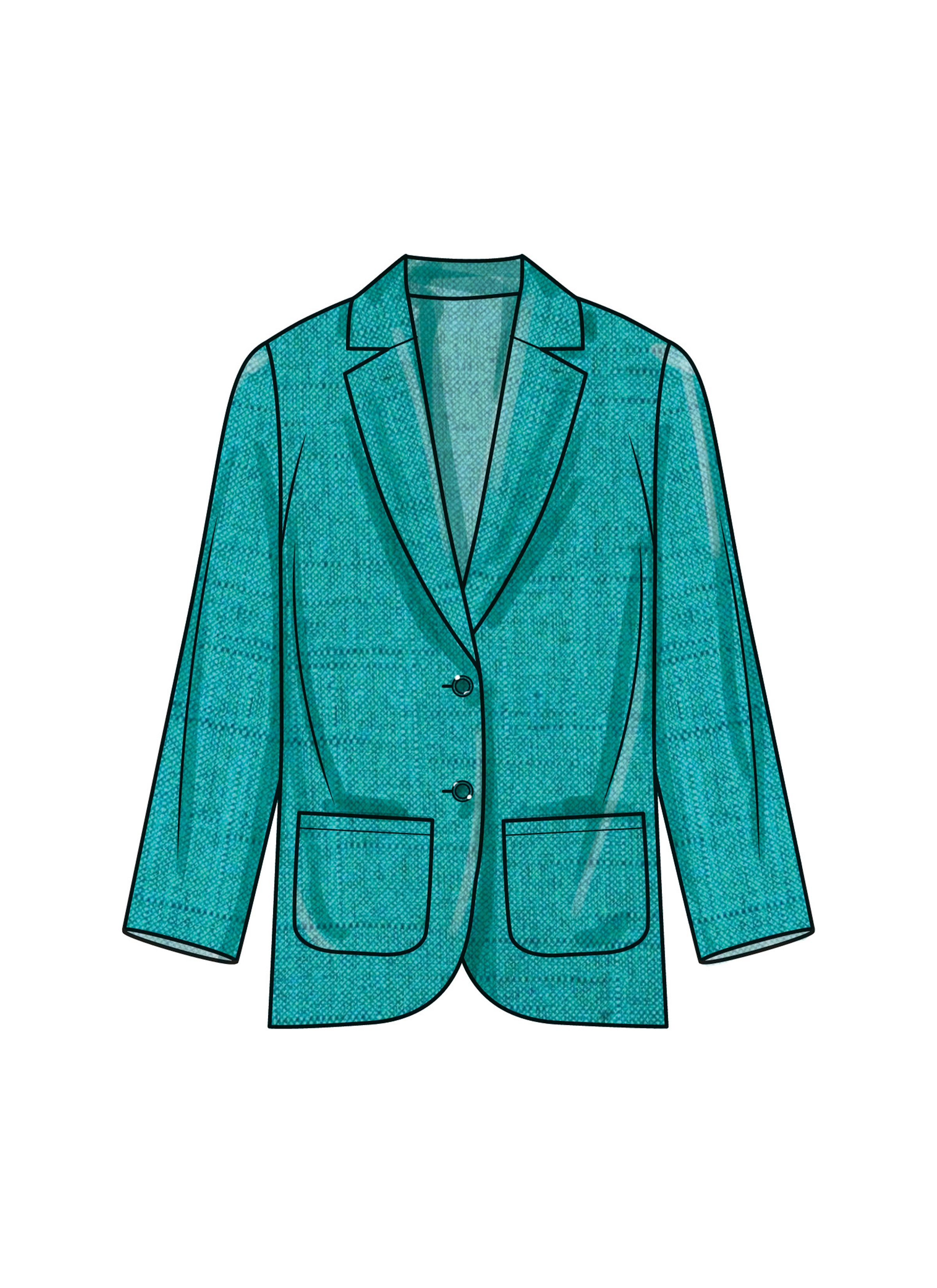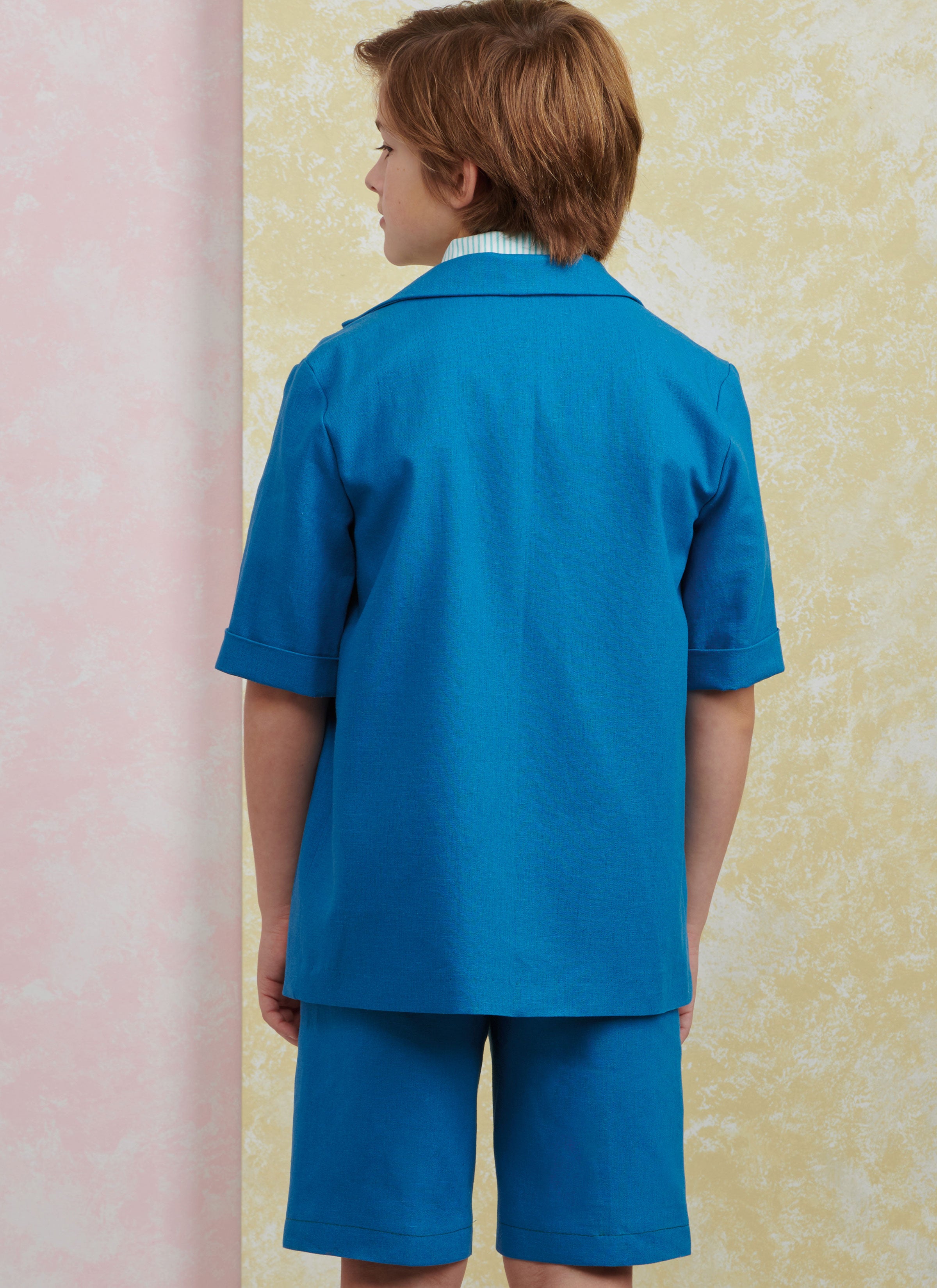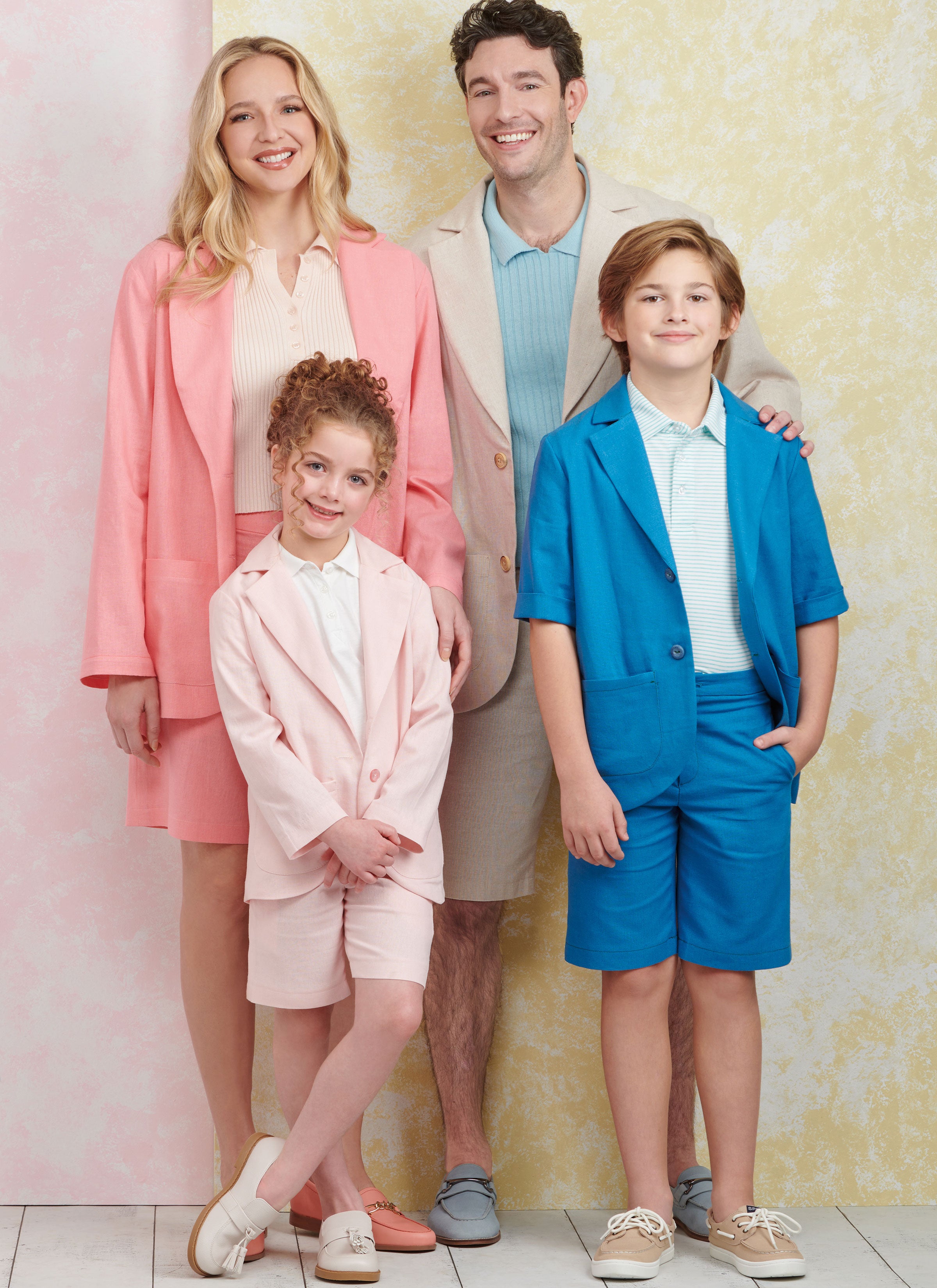 Create these easy-to-sew blazers and shorts for the whole family in matching or coordinating fabrics. Oversized button front blazer with long or short sleeves has notched collar and patch pockets. Shorts have front fly zipper with button closure and side pockets.
