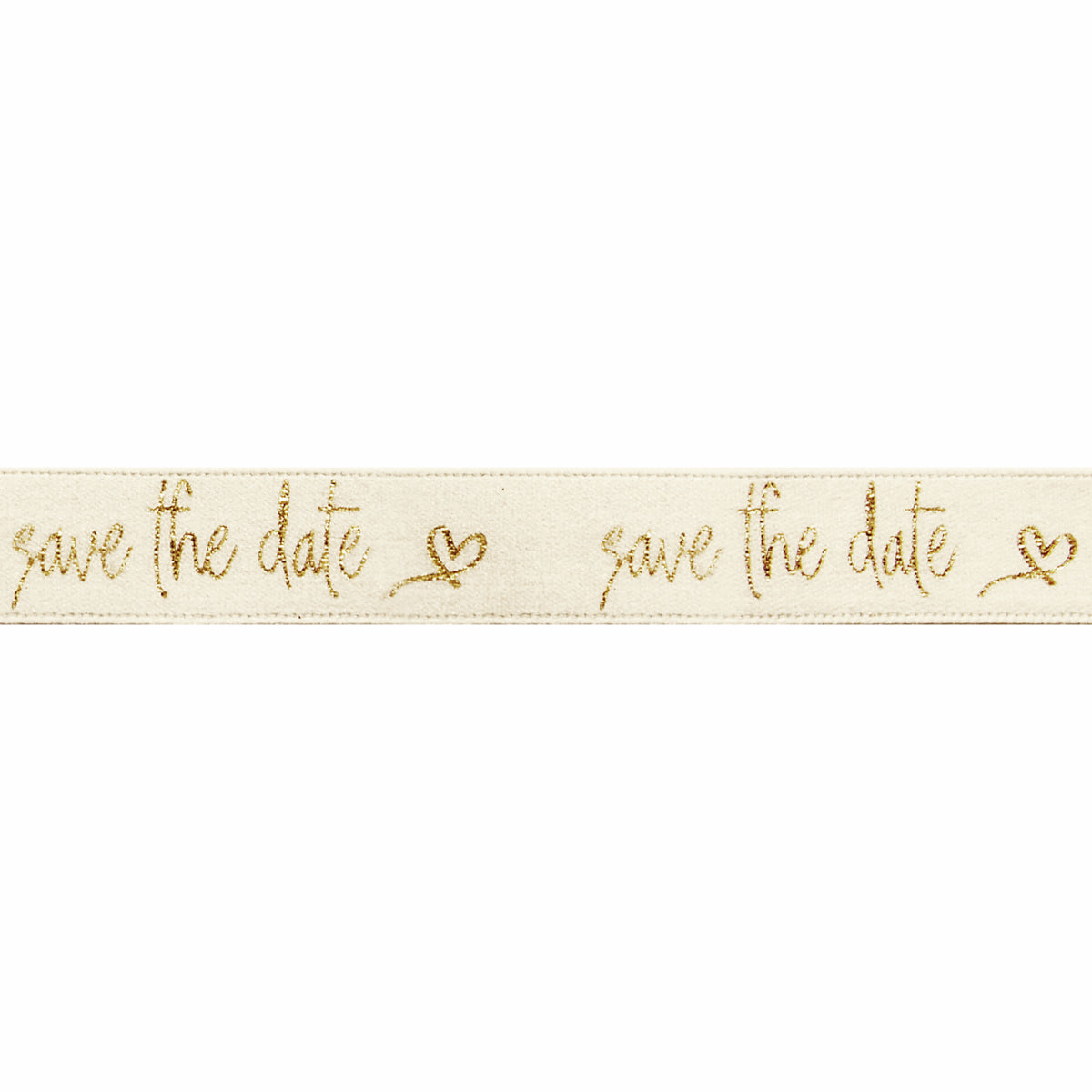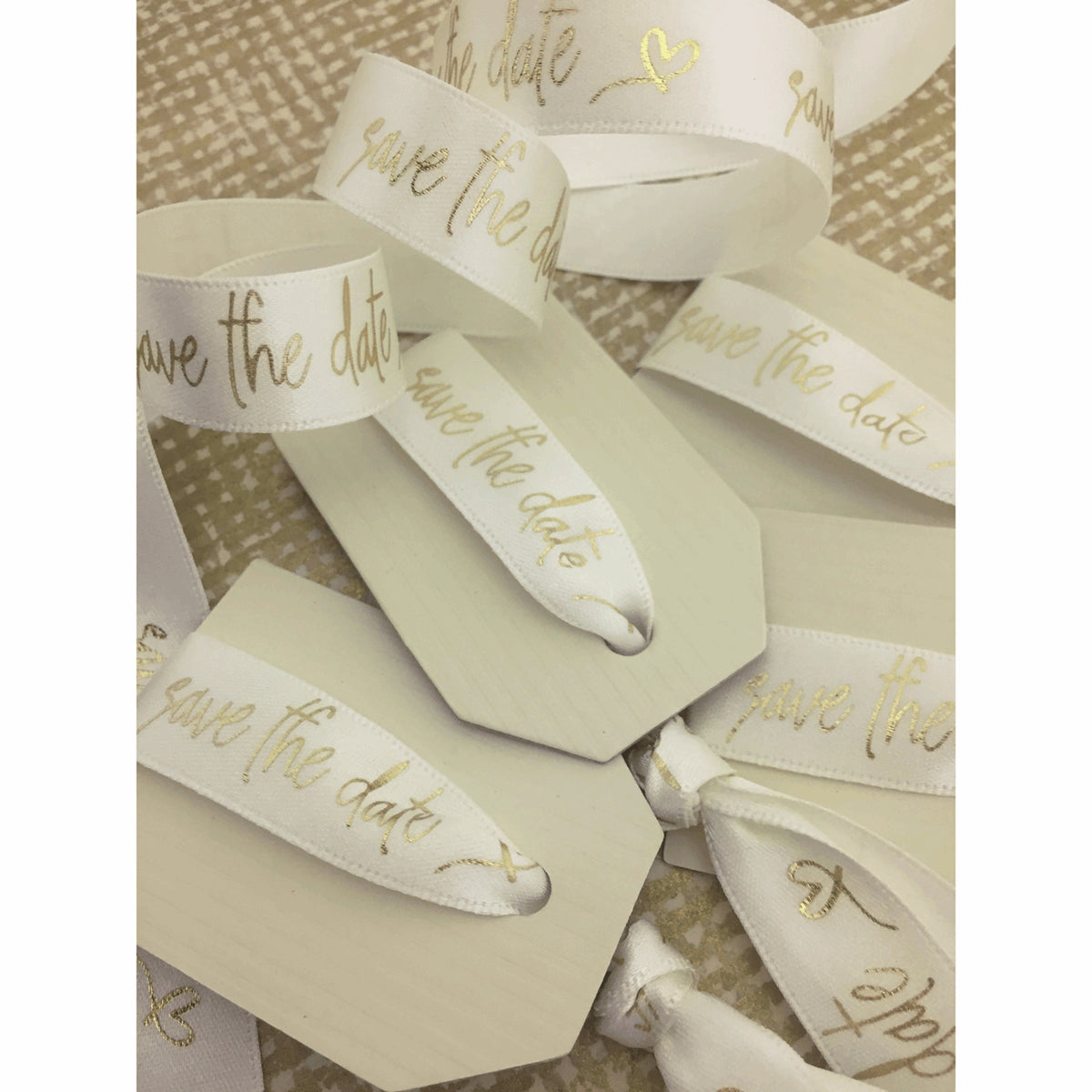 Create beautiful Save the Date cards and finish them off in style with this gorgeous ribbon. Written in a beautiful scripted font, the message stands out in a lovely metallic gold effect, on a plain cream satin ribbon. Tie around your finished card or use it to decorate the card itself!