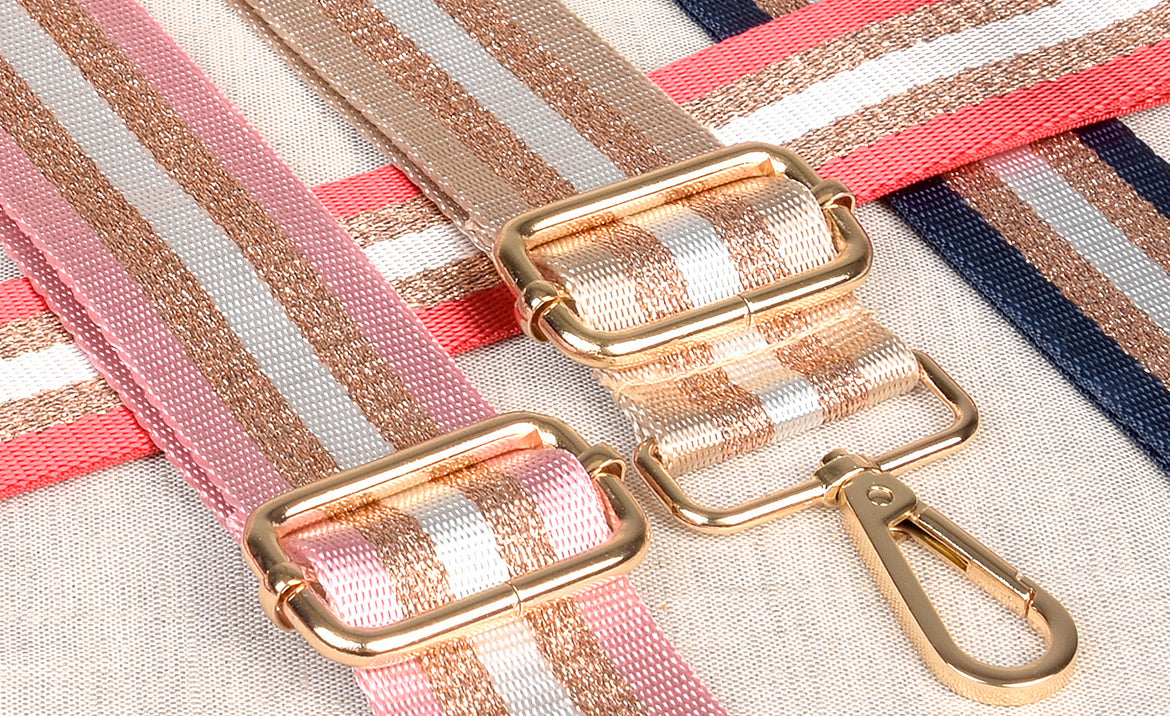 This amazing bag strap is ready to make your projects sing! In a classic striped design, it's finished with a metallic element woven into the webbing, plus some stunning silver hardware attached - all you have to do is clip and go. The webbing is soft and smooth, with a delicate sheen, which makes it both durable and comfortable.