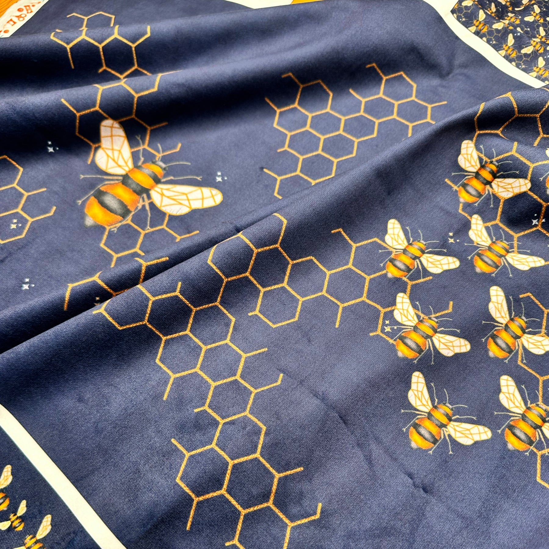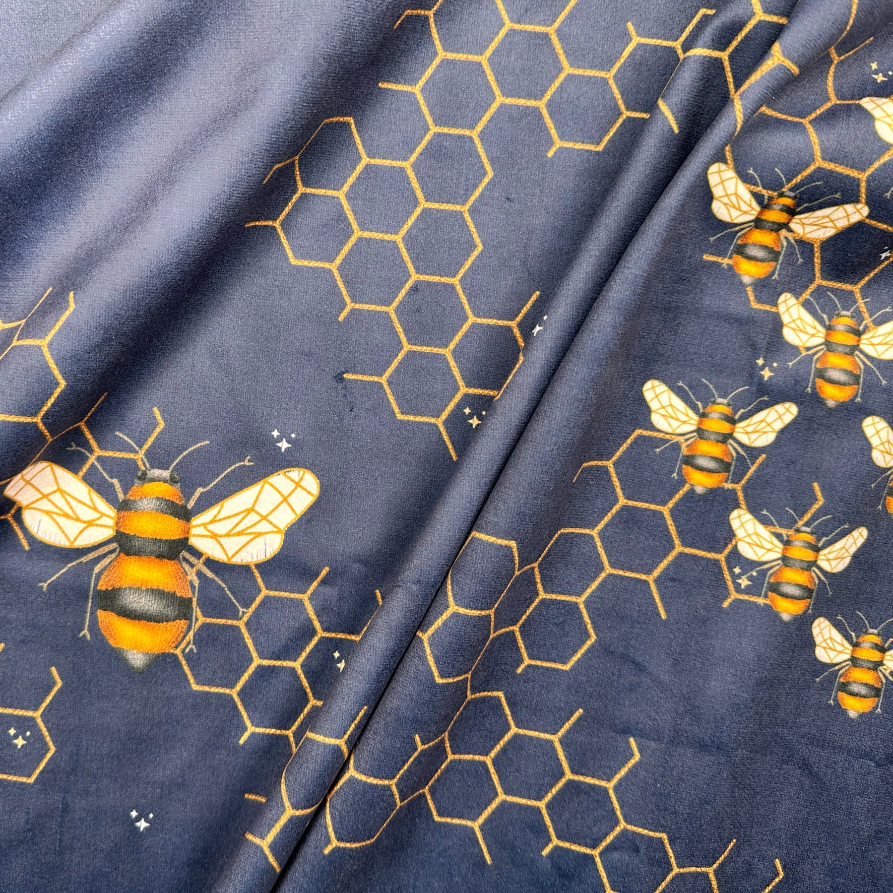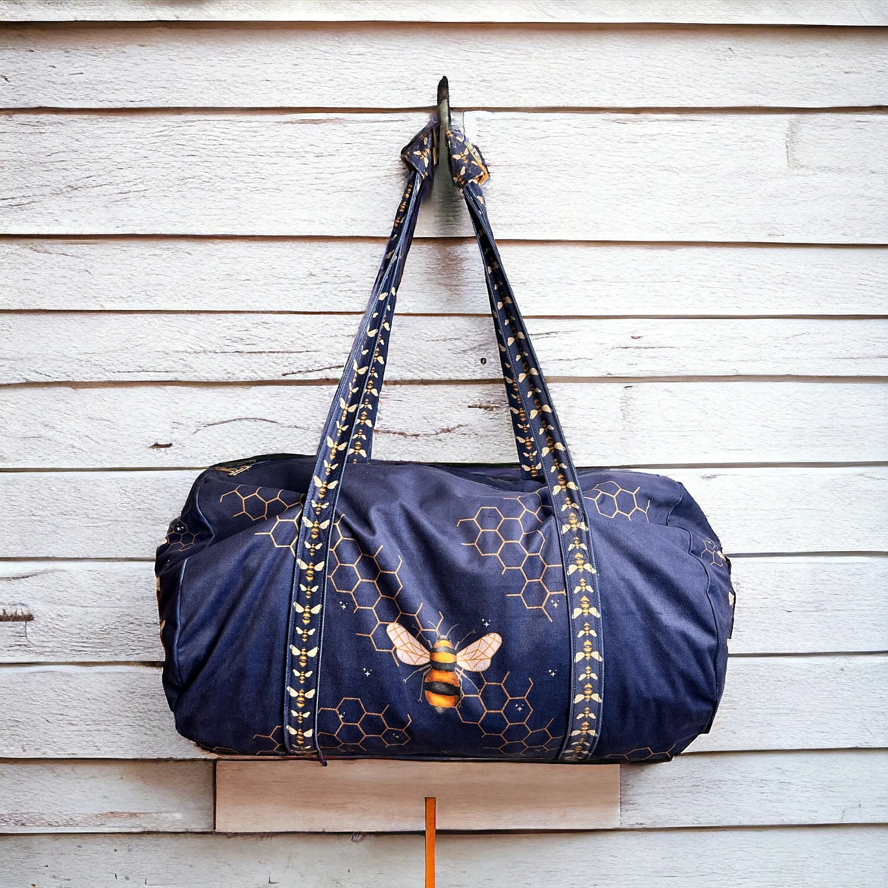 This luxury weekender bag is beautifully illustrated in supersoft velvet, with a contrast cotton lining. The bees are busily flying over the velvet fabric and positioned carefully on each fabric piece to create a true designer bag. The spotty cotton poplin lining is in a matching shade of gold.