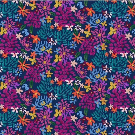 Step into the wild and rustic garden with this gorgeous fabric from Clothworks. Designed in a painted illustration style, it's so dynamic and full of vibrant shades that shine against the navy background colour. Great for quilts, accessories, clothing and more!