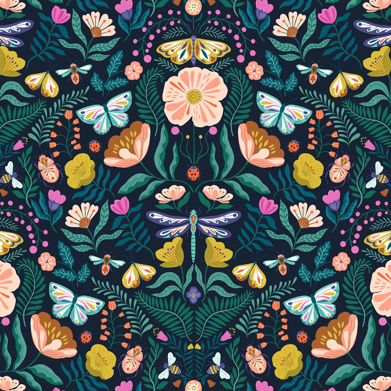 Inspired by gardens bursting with blooms and beautiful butterflies, let Flutter By from Dashwood take your sewing somewhere new. Decorative florals and foliage in a bright summery palette are complemented with dancing dragonflies, snails, bees and ladybugs in this stunning set of prints.
