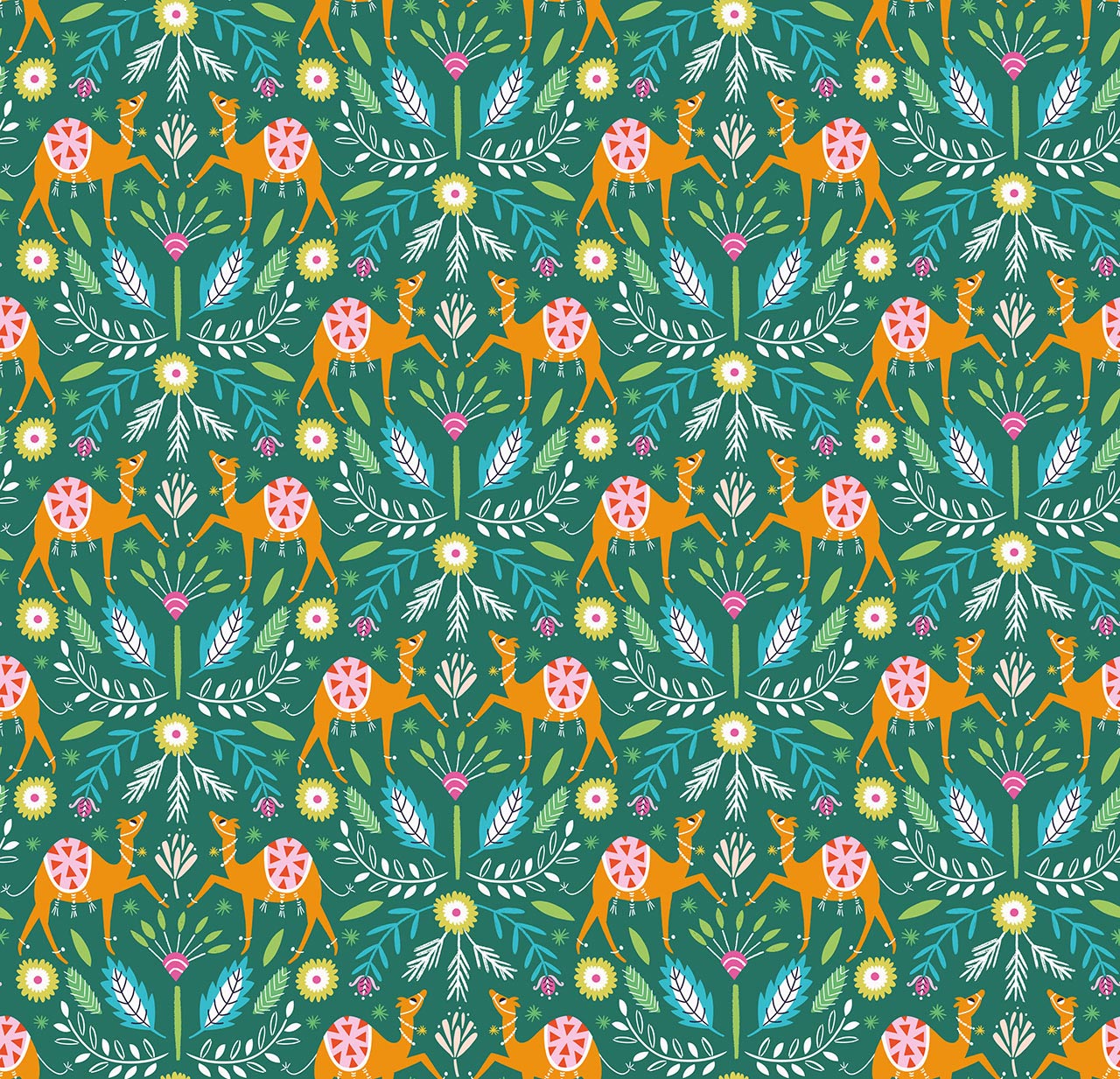 The Silk Roads collection celebrates the amazing colours, sights and sounds of the historical silk road - a traditional trading route from east to west. Full of vibrant shades and 'exotic' sights, it's a collection that explores a riot of colour and style! This fun print features a 'folk' style motif print re-imagined with a more exotic animal - the humble camel! Perfect for quilts, accessories, clothing and more.