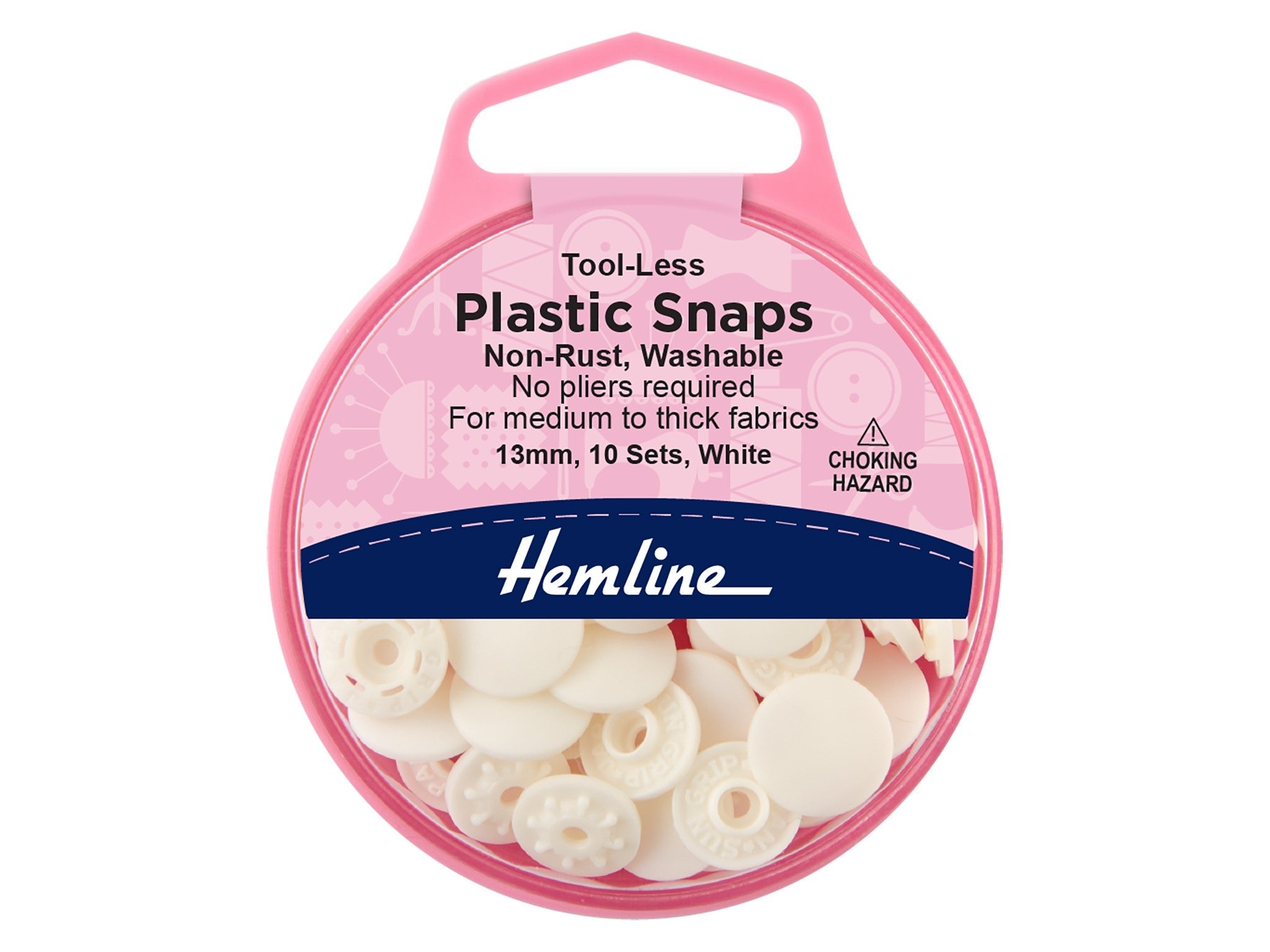 Add easy fastenings to your sewing projects with these handy plastic press fasteners from Hemline. For the first time ever, these press fasteners don't require a tool to apply - and are still as firm as if they had been! Ideal for those who want to try out using snap fasteners, or only want to use them for one or two projects without the investment on an application tool.