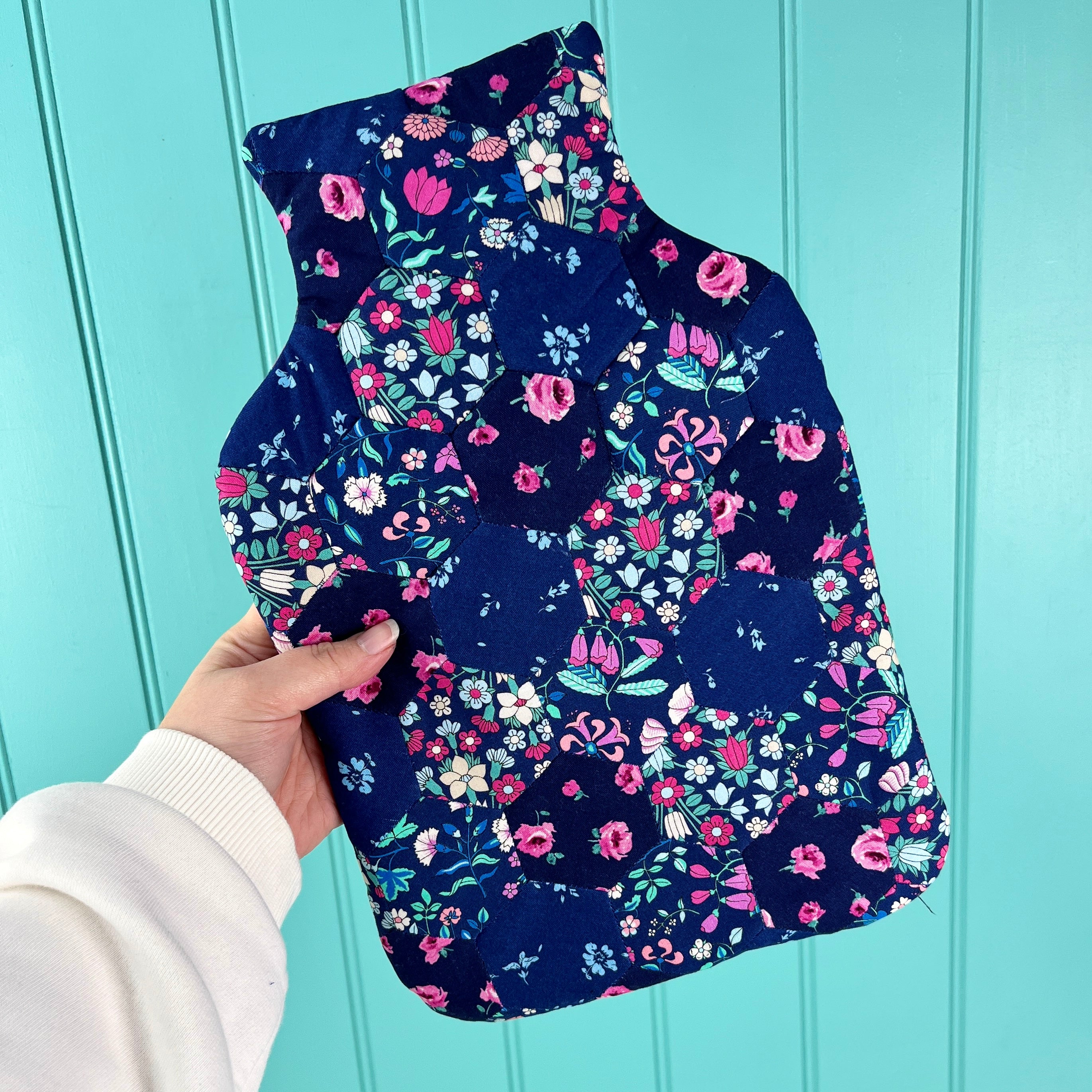 Stay cosy in the cold weather with our hot water bottle cover project. A fun little project that teaches you how to do English Paper Piecing (EPP) in the most gorgeous Liberty floral prints, perfect for some slow stitching in front of the tv.