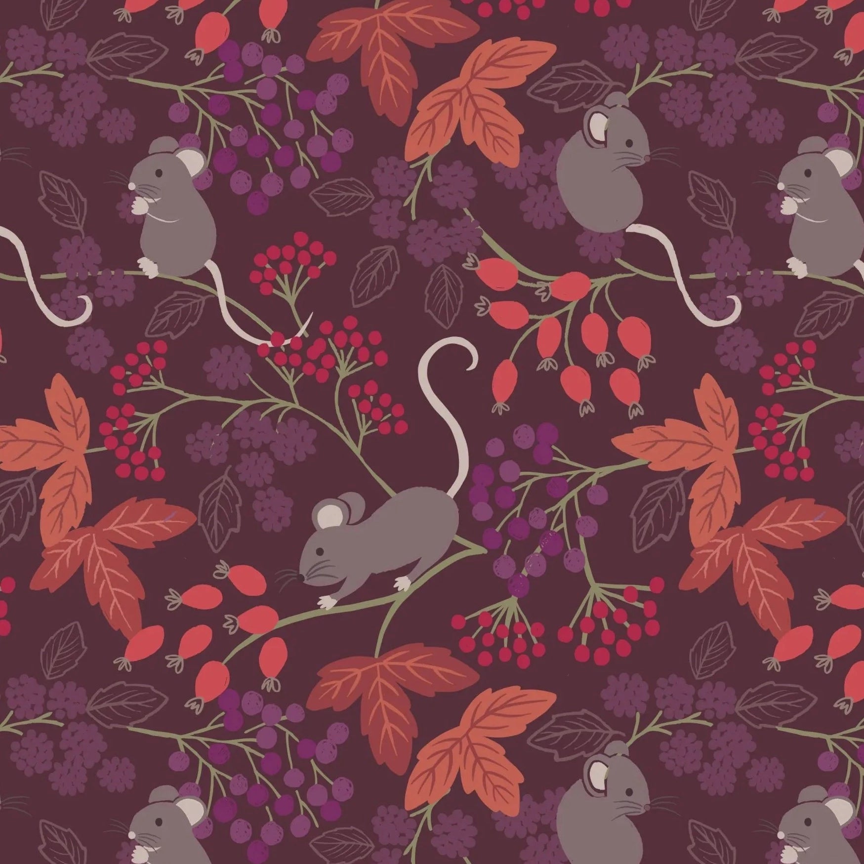 Lewis & Irene Autumn Fields Reloved - Mice with Berries Dark Berry - 100% Cotton Fabric