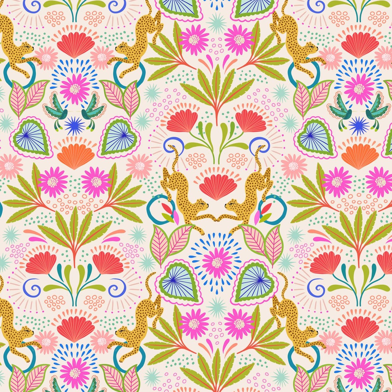 Get ready for an explosion of colour with this vibrant collection from Lewis and Irene! Inspired by the tropics of Brazil, this collection is rich and lush with tropical foliage and flowers, reflecting the power and exuberance of the carnival. This jaguar print is as fun as it is bold, bursting with rich pink and blue shades, and tiny little jaguars ready to pounce!