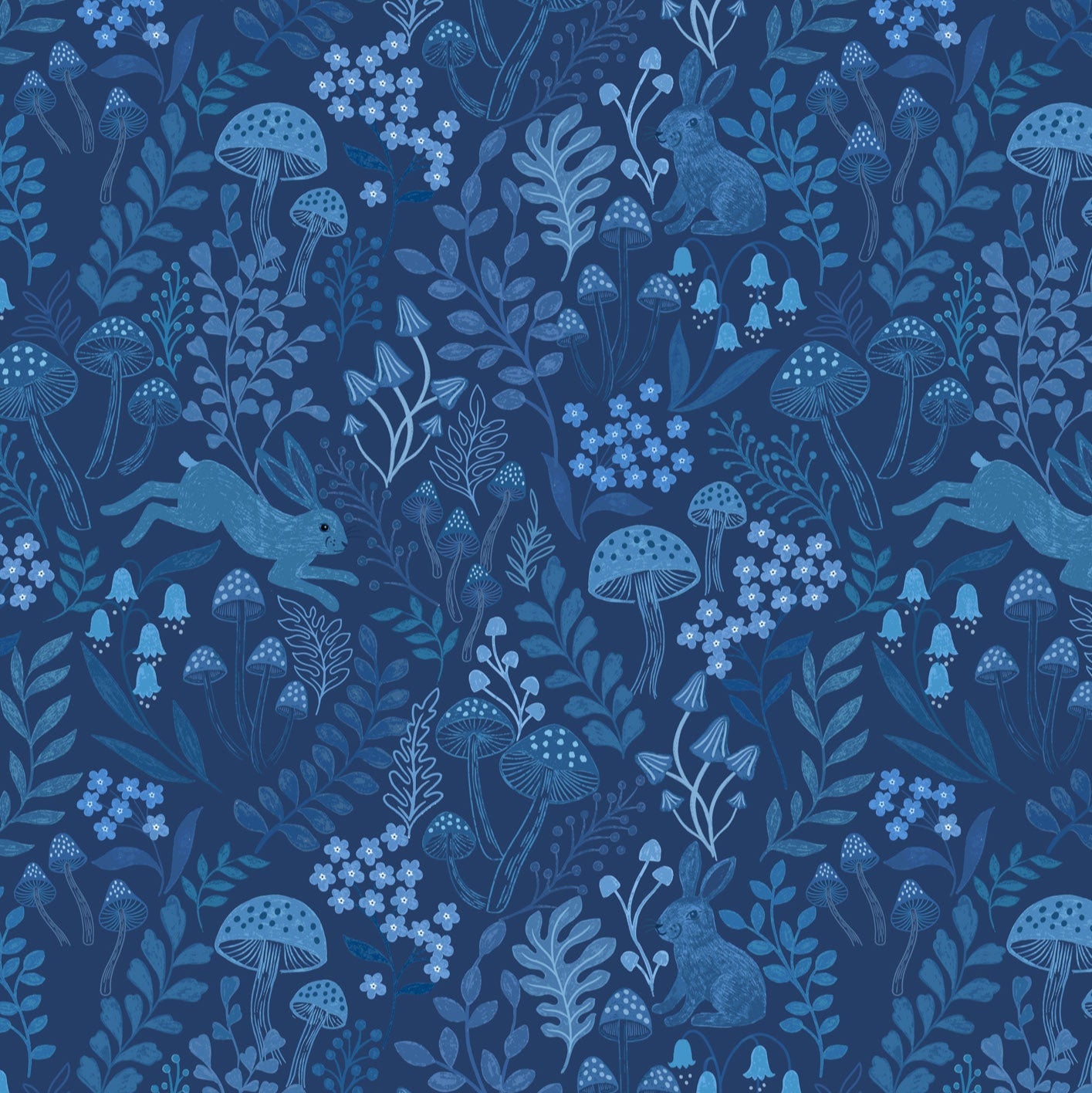 This folk-style print is busy with bouncing bunnies, cheerful toadstools and winding fronds of foliage, in rich shades of blue set on a dark blue background for a ghost-print effect.