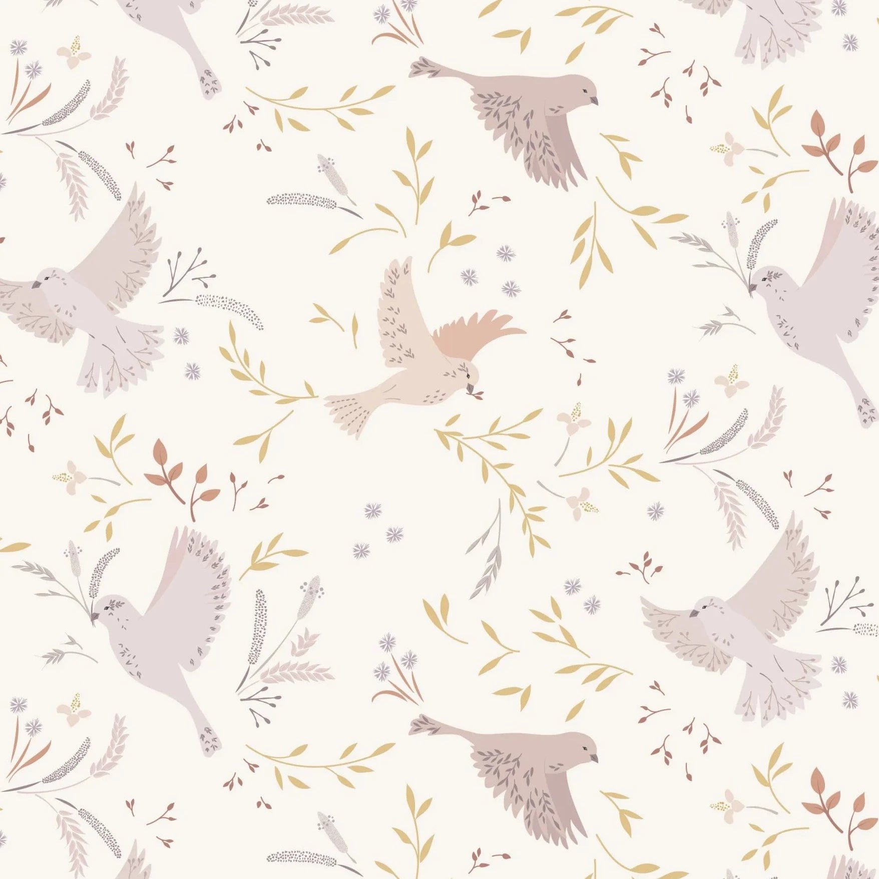 Lewis and Irene are back with another collection from surface pattern design Cassandra Connolly. This soft and muted set of prints is a gentle and romantic, in a calming colour palette of ecru and blush. This elegant print features beautiful birds in flight, gathering stems of the hedges to build their nests.