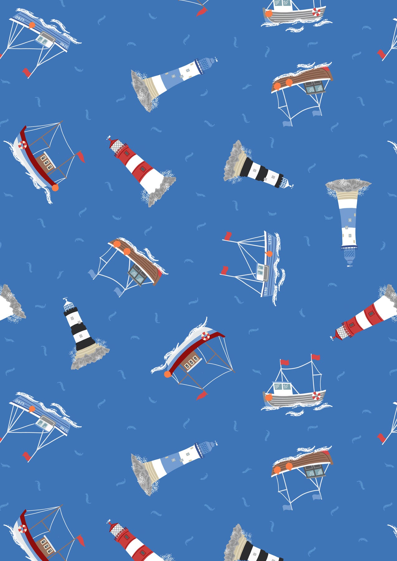 Lewis & Irene Small Things Coastal - Boats & Lighthouses Bright Blue - 100% Cotton Fabric