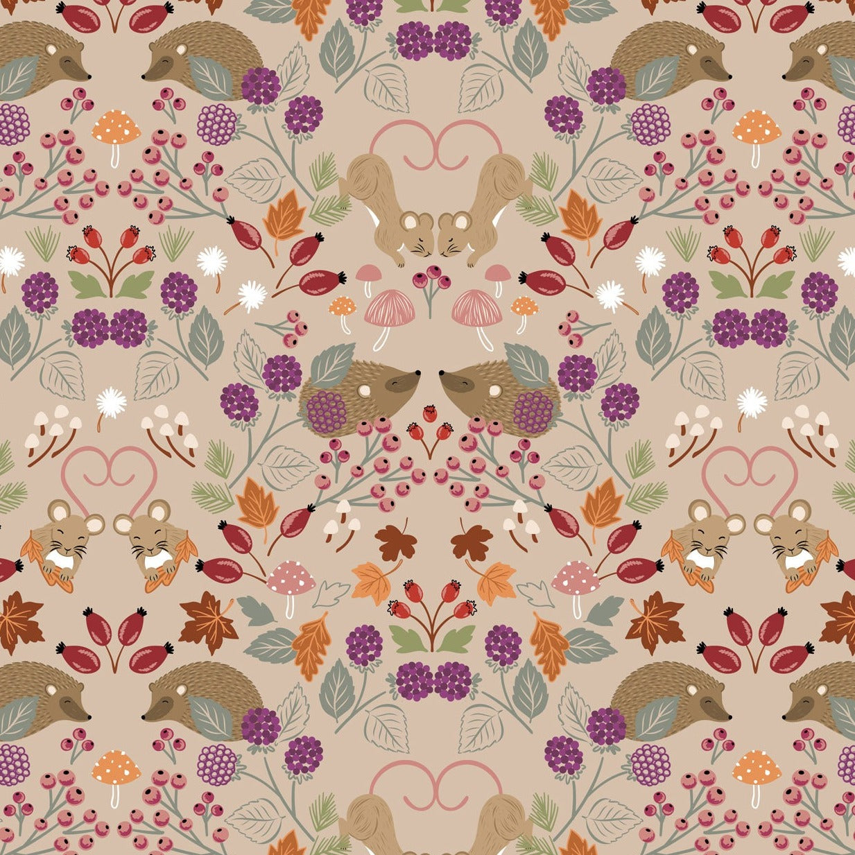 Get cosy with this fun woodland collection from Lewis and Irene. Made in warm shades of cream, berry and taupe, it celebrates the wildlife of autumn and especially the sweet squirrels! This print features sweet little mice and hedgehogs sleeping among the bushes as they hibernate for winter.