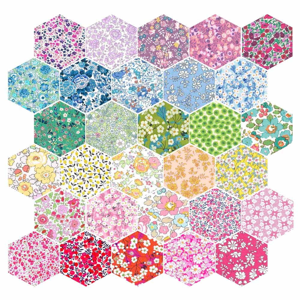 This pack includes 30 laser cut Liberty London fabric hexagons, in a rainbow of different shades. The hexagons measure 1-3/4″ sides, and each has 30 different fabrics.