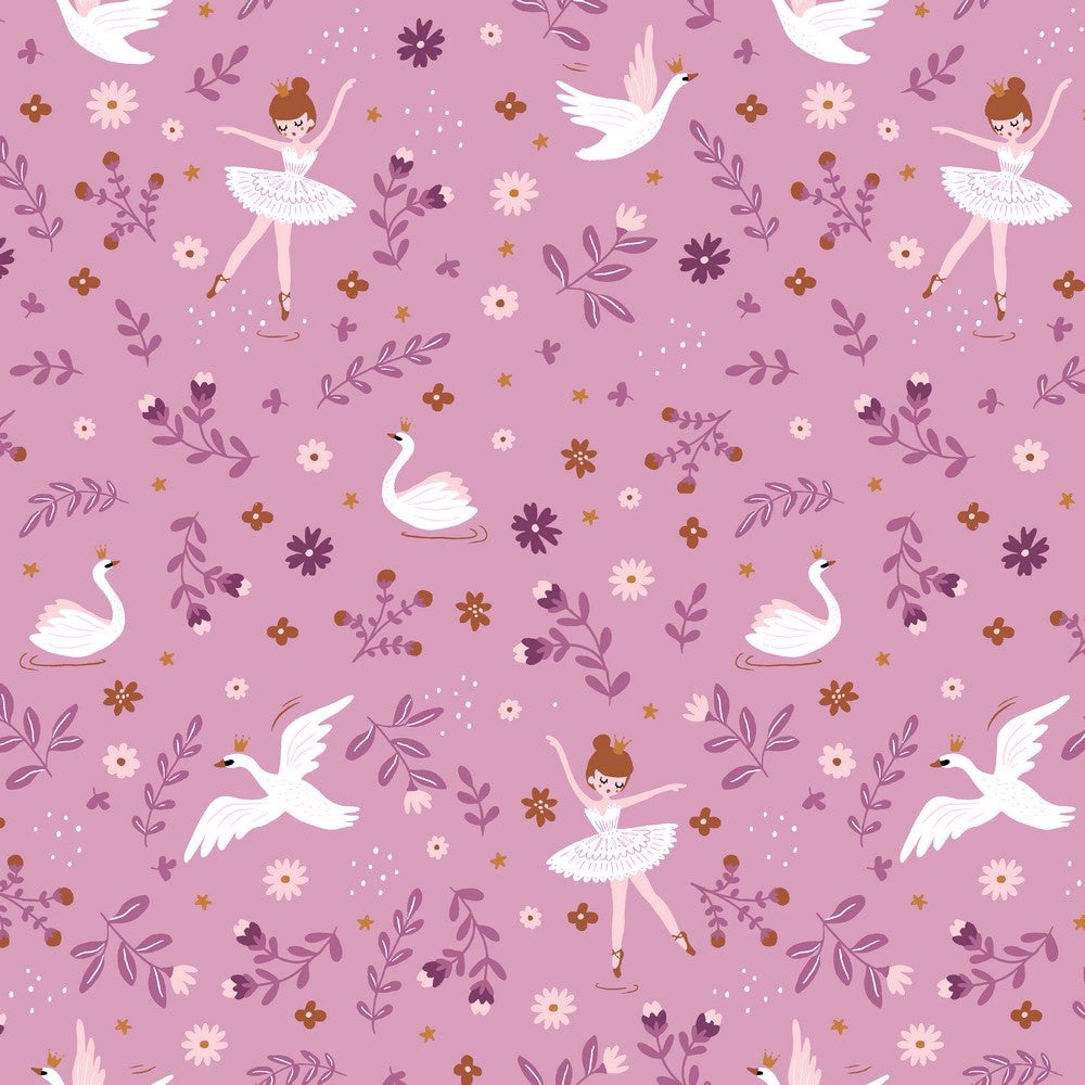 This sweatshirting is super soft on the back for ultimate comfort, and has a lovely 2 way stretch, making it ideal for comfortable clothing like hoodies and trousers. This sweet ballet-inspired print features prima ballerinas showing off their amazing pirouettes as they dance through the fields of flowers and foliage, seeing some elegant swans along the way that remind them of Swan Lake!