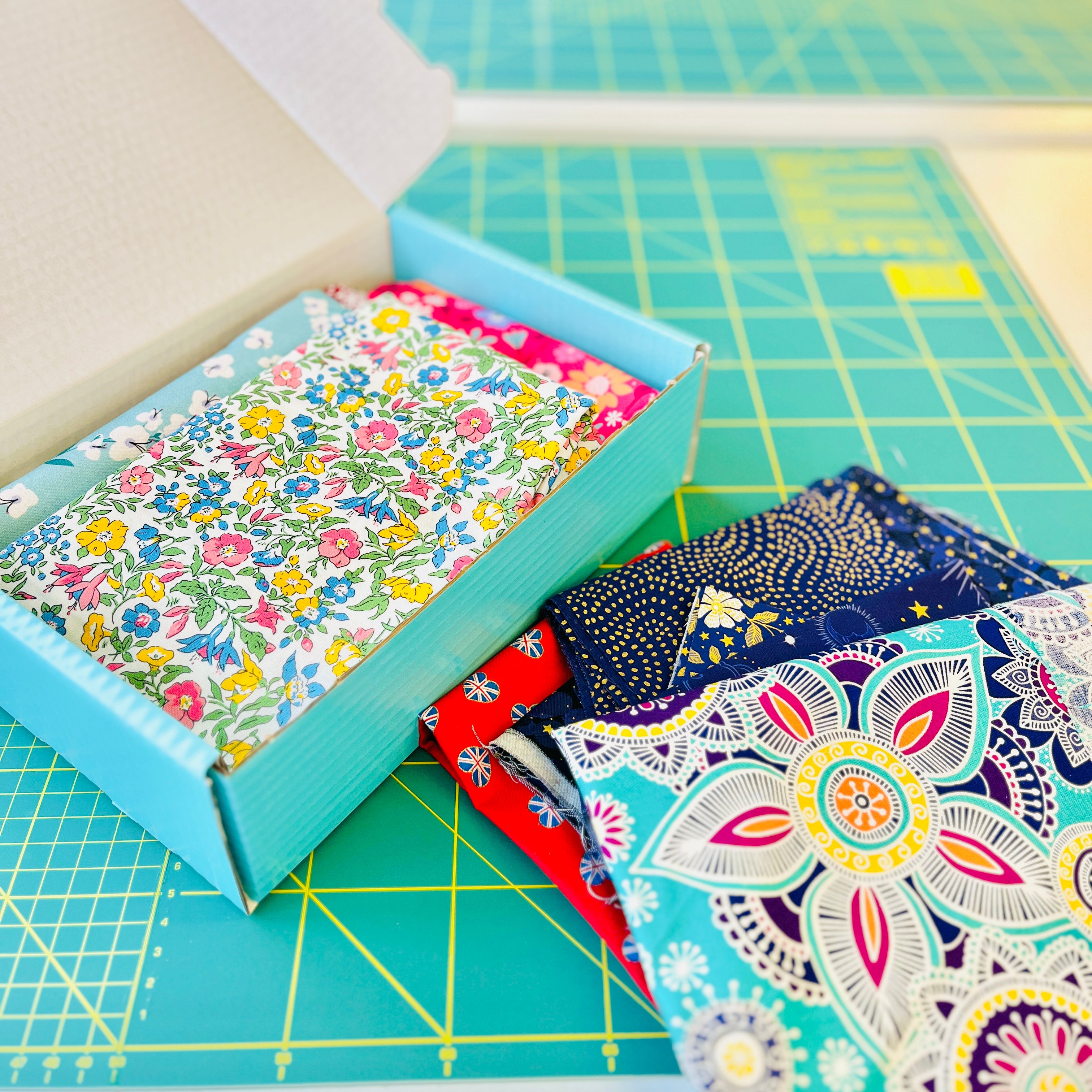 Each box is 28cm x 20cm x 8cm and what's inside is a complete surprise because it will be unique to each box, but you will get a nice variety of different styles and colours. You'll get 18-20 pieces of fabric in your box, but potentially more - it depends on their size! We'll be filling it right up to the top for you to enjoy...
