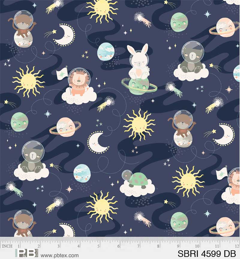 A fun and friendly collection for young children from P&B Textiles. Star Bright is an adventure into the sky, featuring sweet little animals exploring the stars. This animal print finds baby bears, lions, bunnies and monkeys floating among the planets, sun and clouds. Ideal for quilting, patchwork, dressmaking, bags, nursery accessories and more!