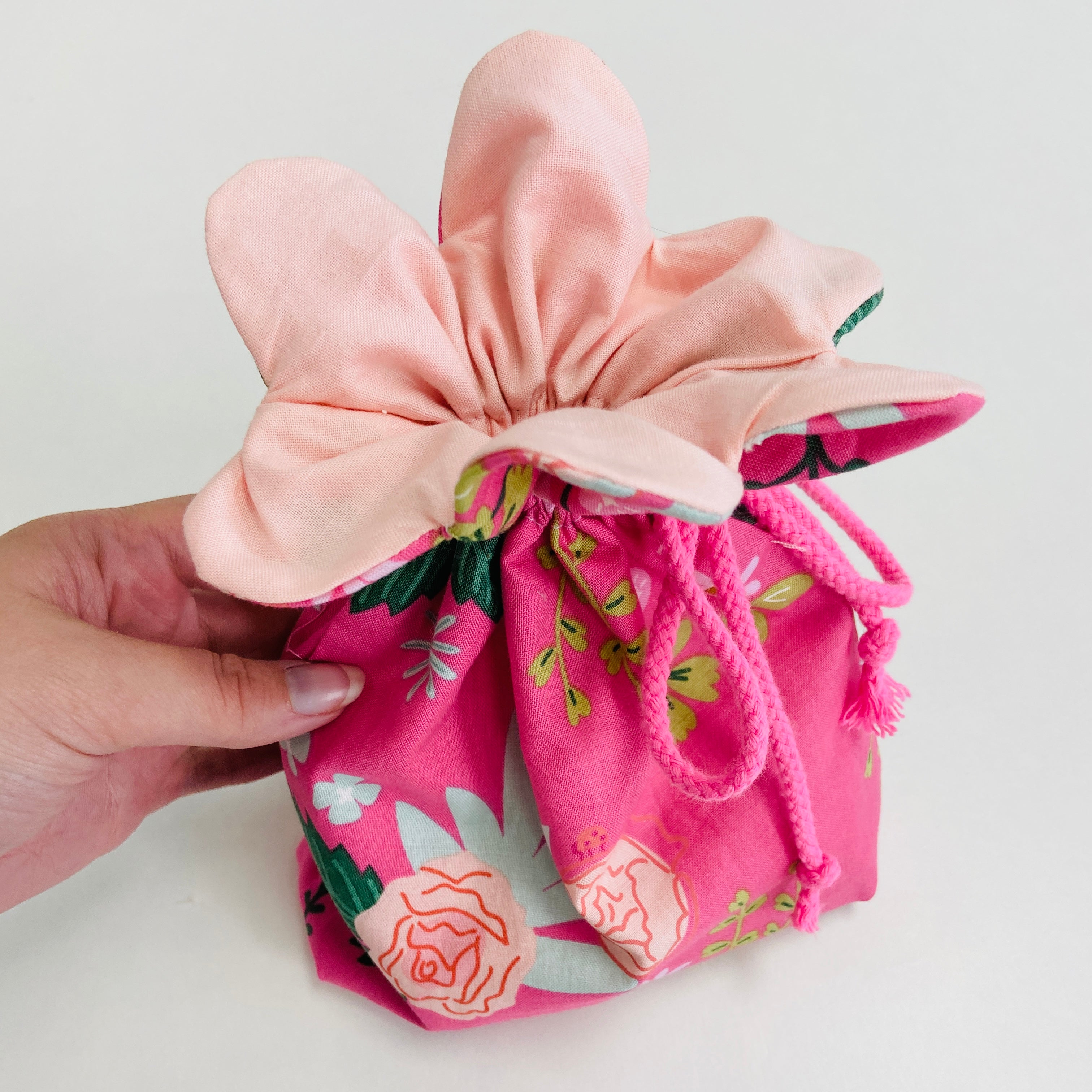Make a cute drawstring bag that's perfect for gifting with this simple project that's ideal for beginners. With a boxed bottom for easy standing and filling, it has the prettiest scalloped top that forms a sweet flower shape when the cord is drawn together! Ideal for wowing friends and loved ones with something extra special.