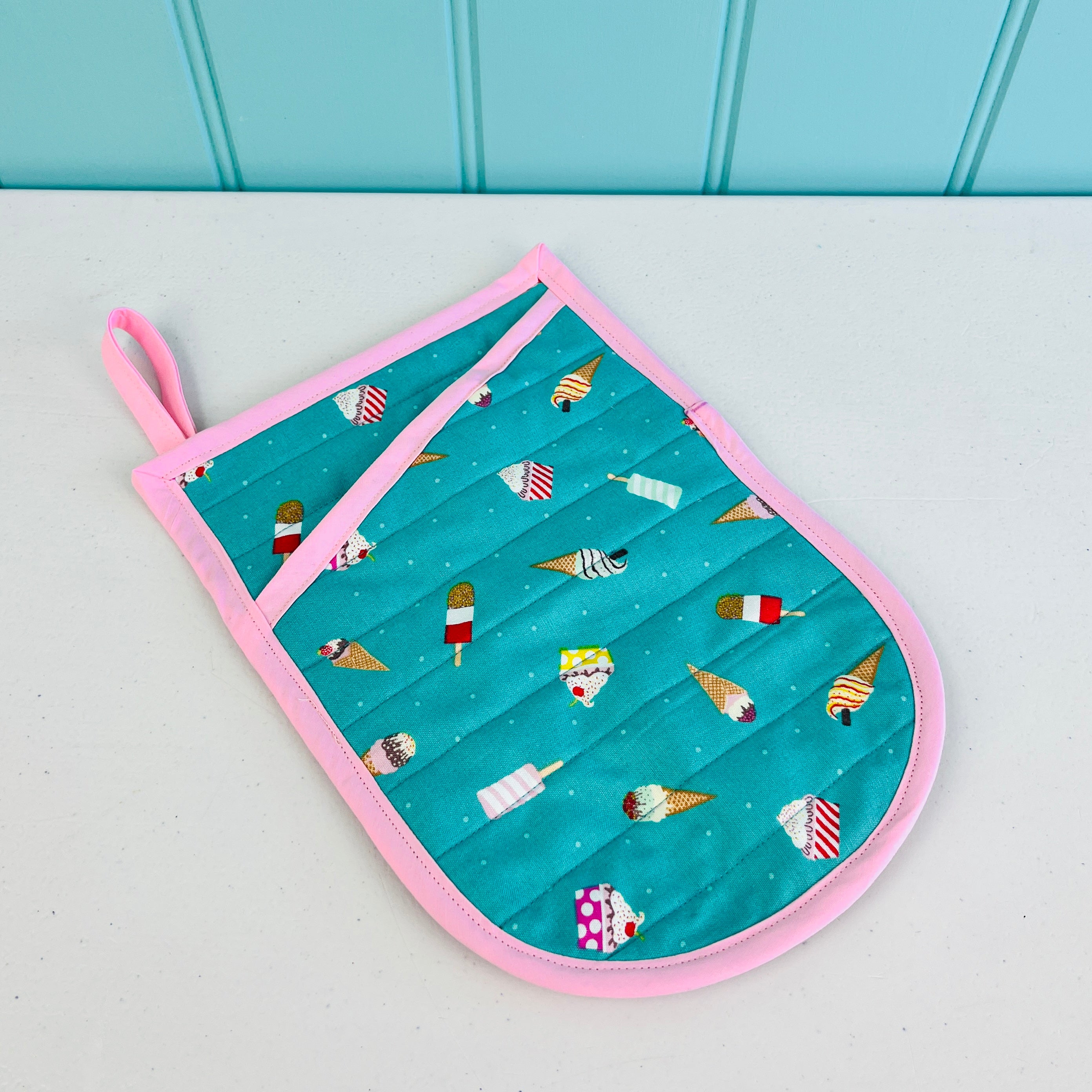 Make something pretty AND practical with this simple oven mitt project. Suitable for beginners looking to try something more complex than a basic cushion or bunting, you'll do a bit of basic quilting and binding to create a fun mitt to help you get those hot dishes to the table without burning your hands!
