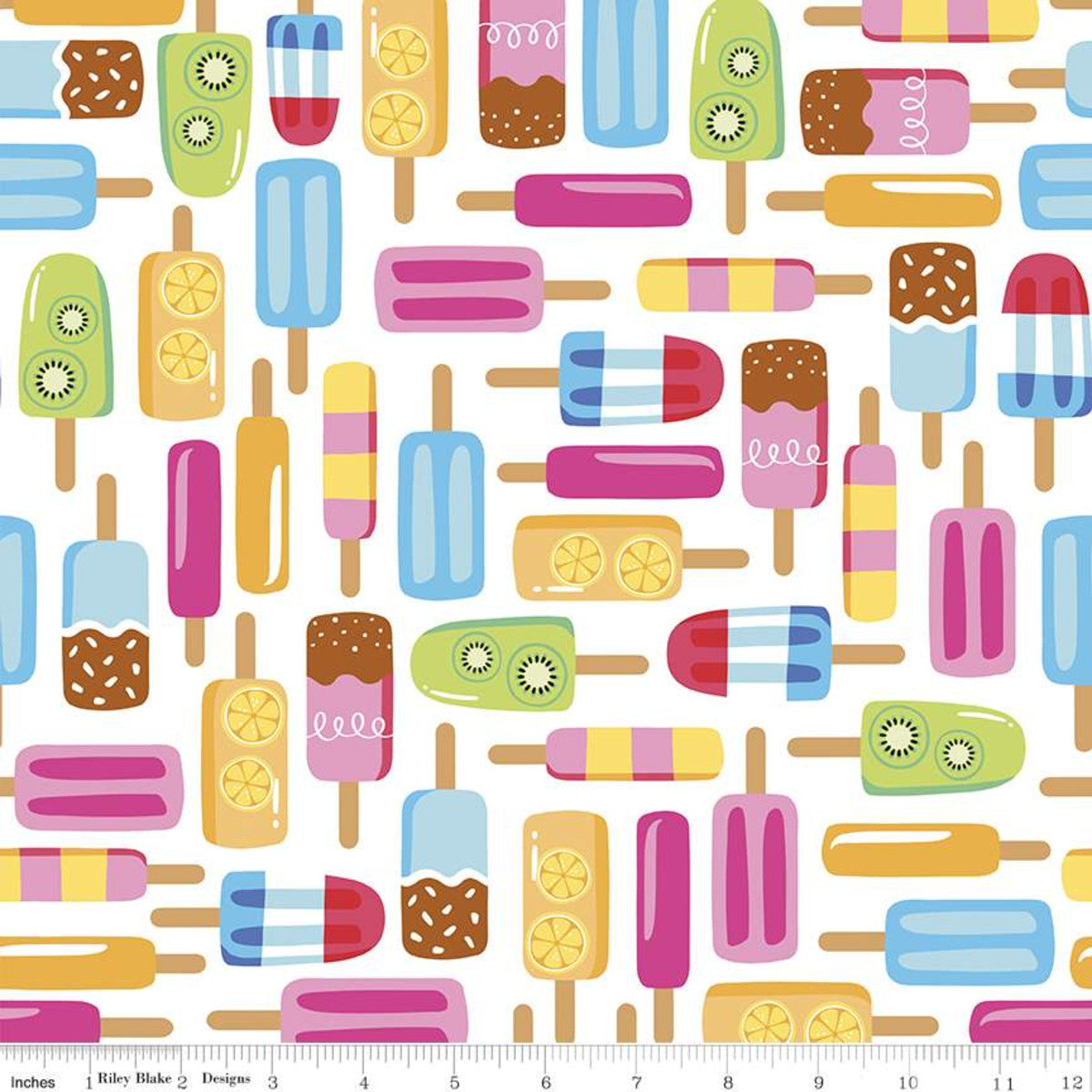 Get that summer feeling all year round with this juicy collection from Riley Blake! Full of colour and fun design, rainbowfruit will have you feeling ready to enjoy those summer vibes any time you look at it. This fun ice lolly design is full of bright and colourful iced delights, decorated with yummy fruits and sprinkles. Use it for everything from quilts and patchwork projects, to accessories and clothing.