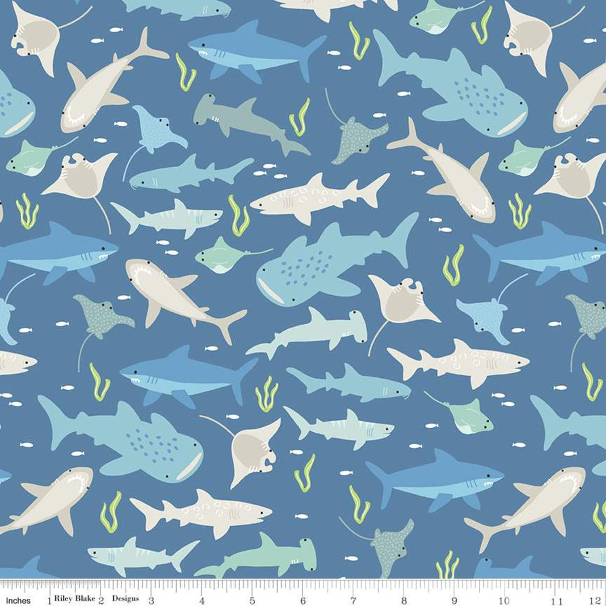 Take a trip to a surfers paradise with this chilled out collection from Riley Blake. This cool print features the surfers nemesis... the sharks of the sea! But with their friendly faces and stingray pals, they don't seem so bad! Use for a quilt, backing, for garments like shirts or for home accessories.