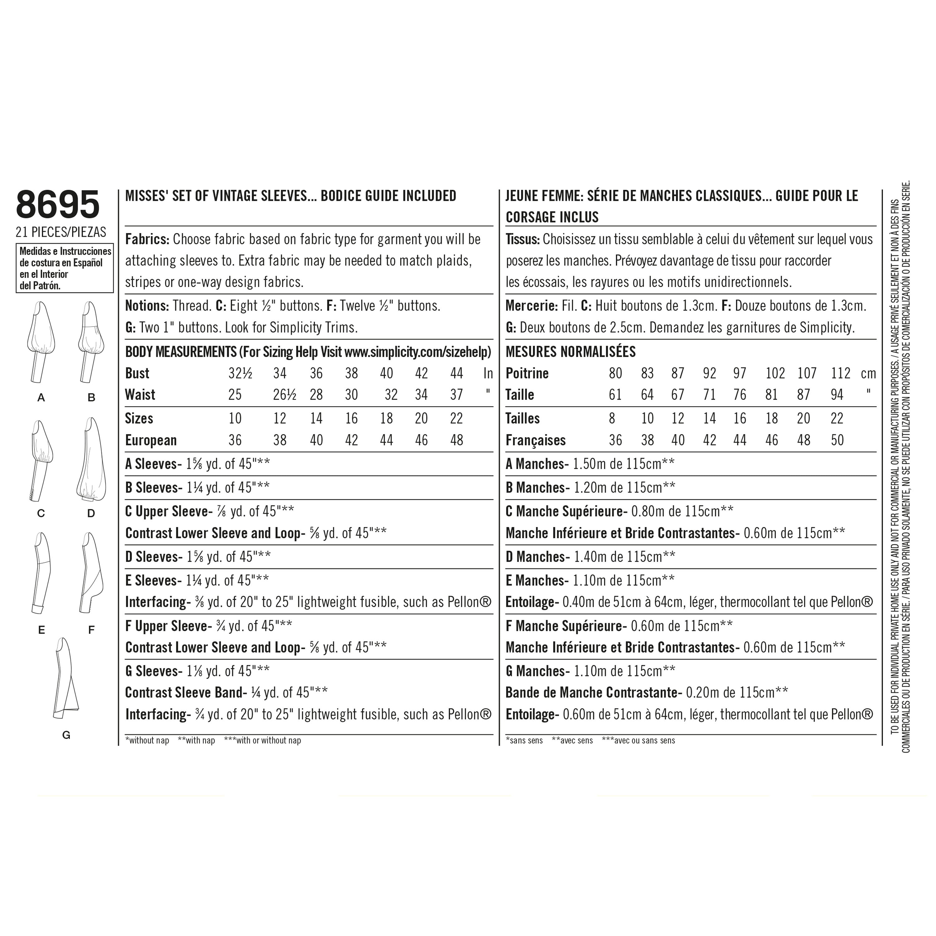 Simplicity Sewing Pattern S8695 - Women's Vintage Set of Sleeves