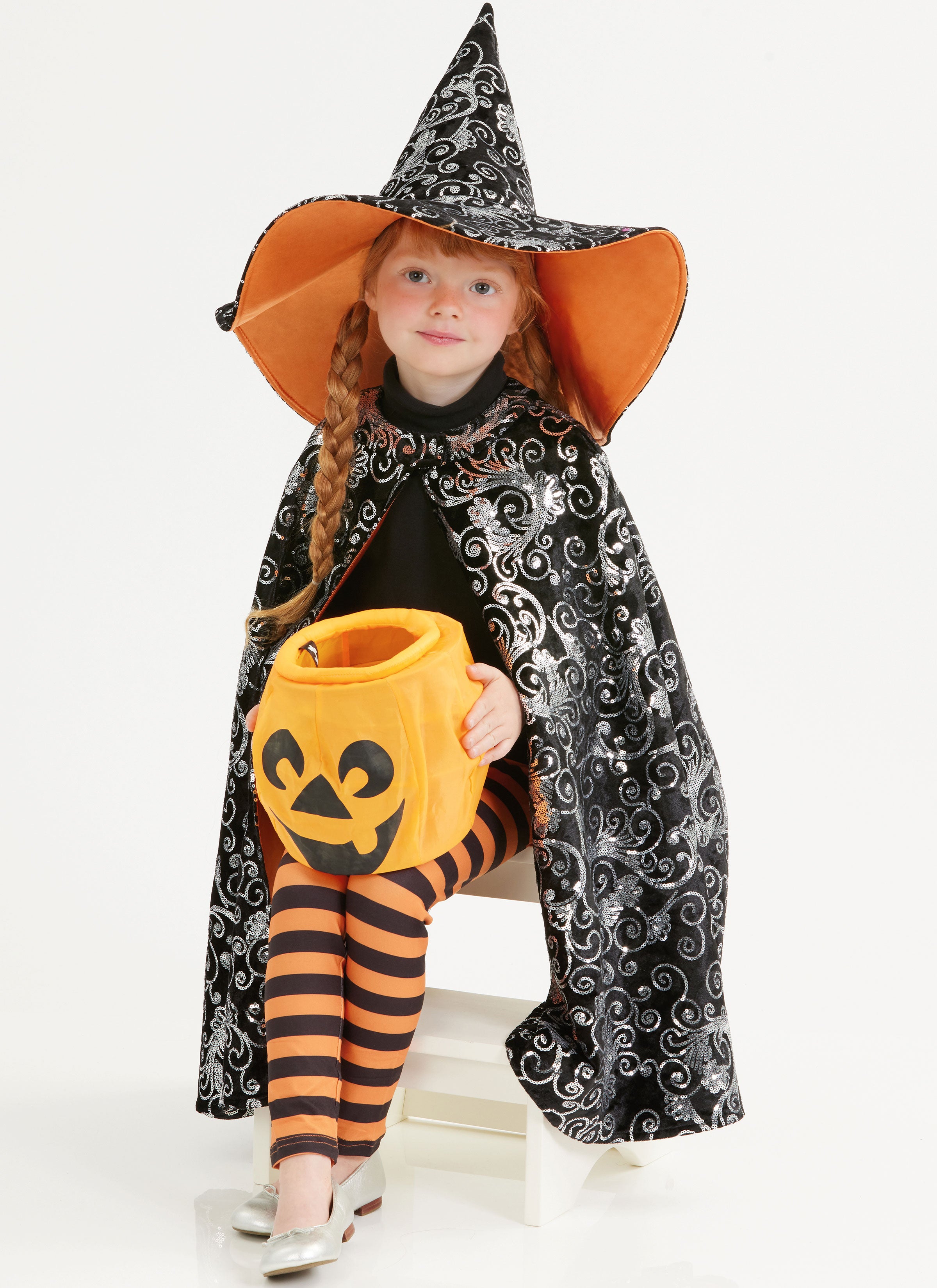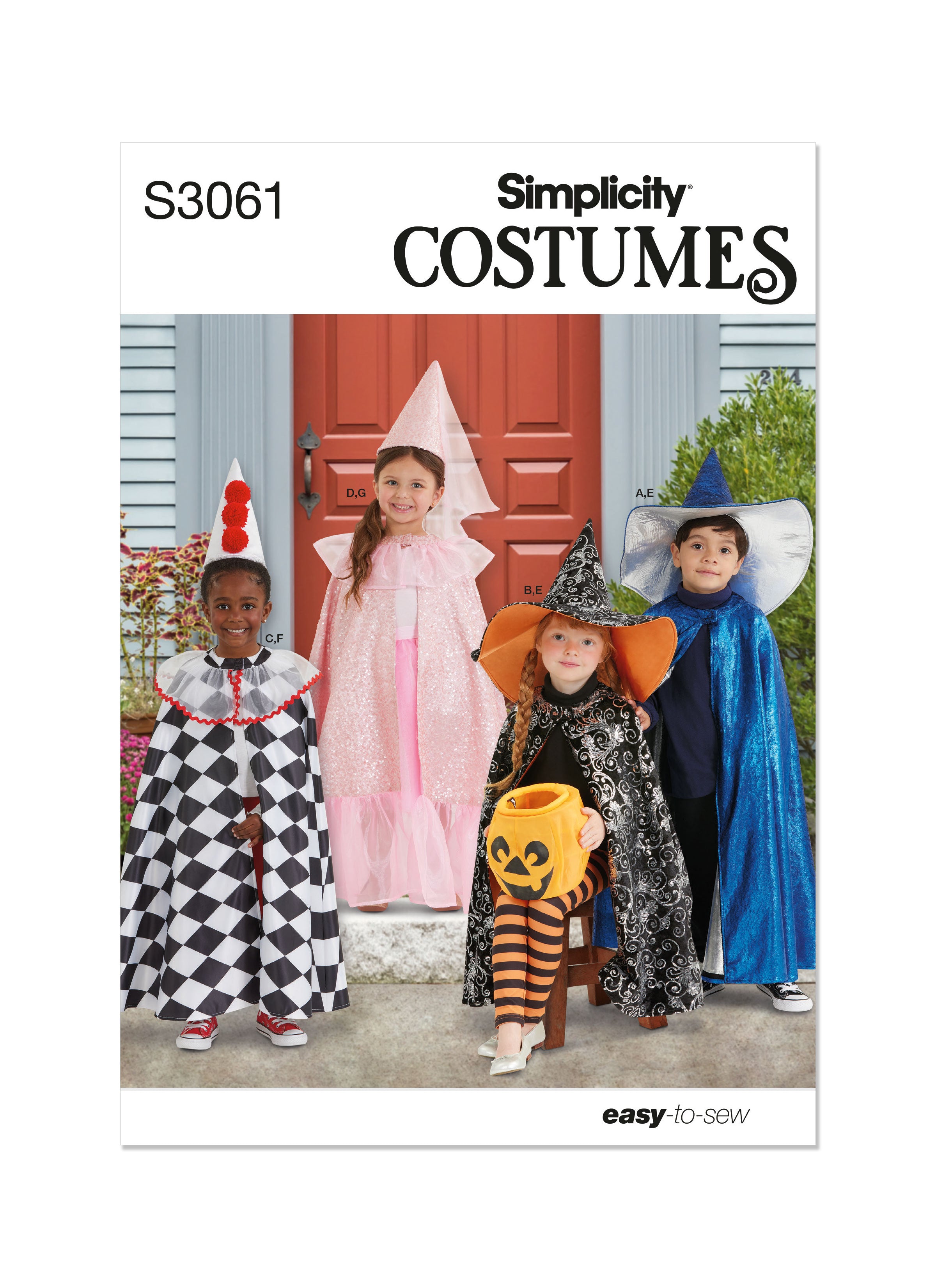 Lined capes in calf or knee length have neck bands with front hook and loop tape closures and can be made with contrast neck ruffle or contrast neck and hem ruffles. Neck ruffle can be accented with rick rack trim. Hats in three sizes S-M-L have stiff interfacing to help hold their shape. Witch or wizard hat has contrast brim and lining; clown hat has yarn pom poms; princess hat has sheer cascading veil. See envelope for more information.