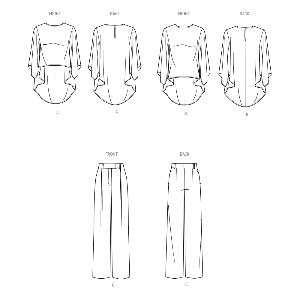 Crew neck tops with cape element have three-quarter sleeves, high-low hem and keyhole back opening with button closure. Floor length pants have front pleats, side seam pockets, front fly zipper and waistband with belt loops and button closure.