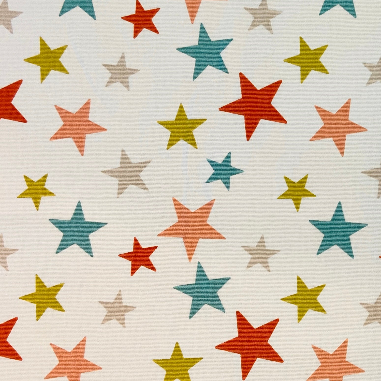 Keep it simple with a stunning star print in summery shades! This classic print features a mix of different size stars, in warm summer shades of coral, teal, lime and natural. Made from a medium weight cotton base, you could use it for curtains or cushions in or even make a bag out of it.