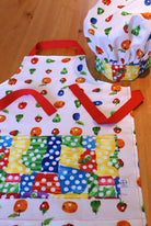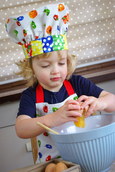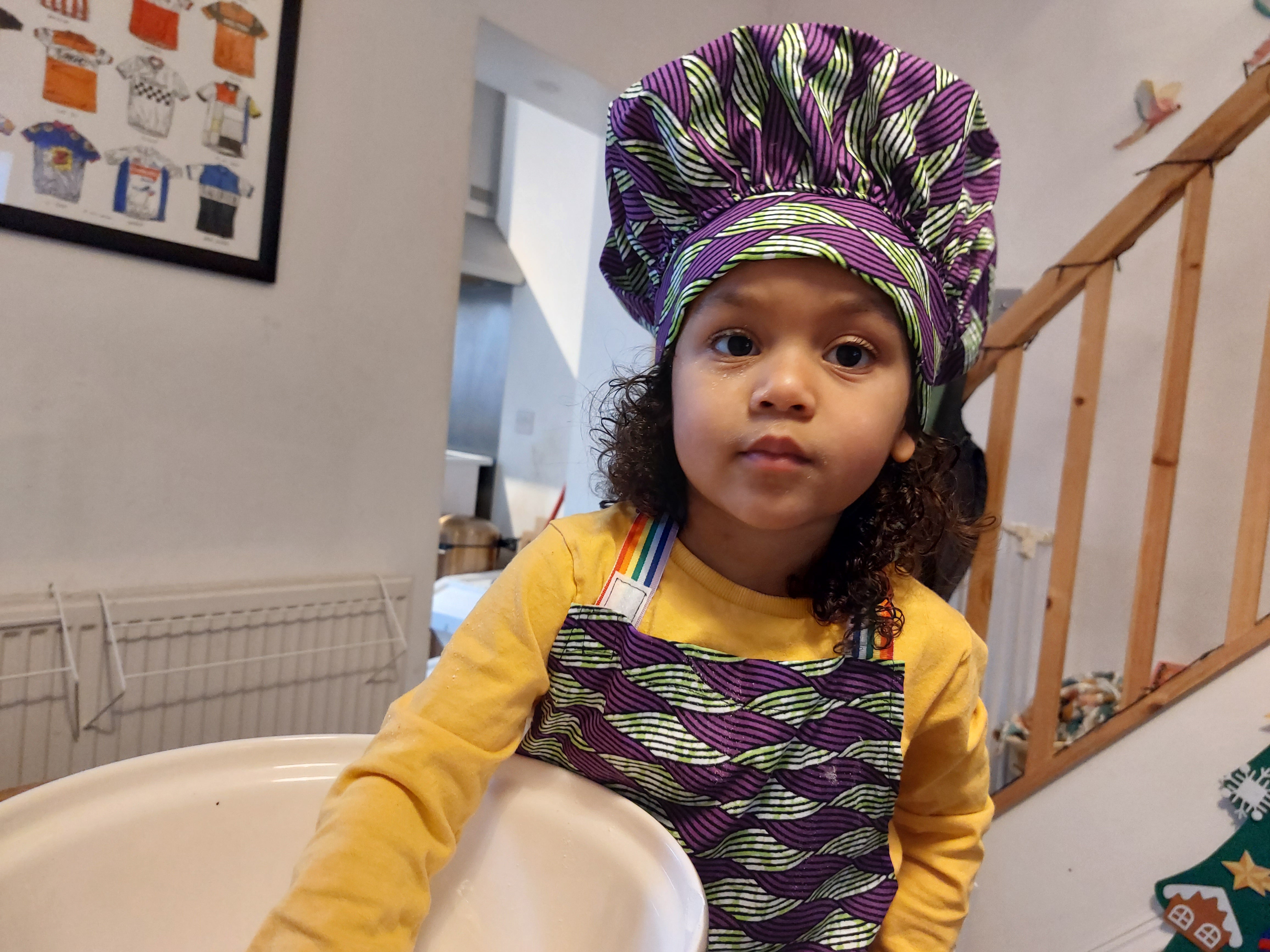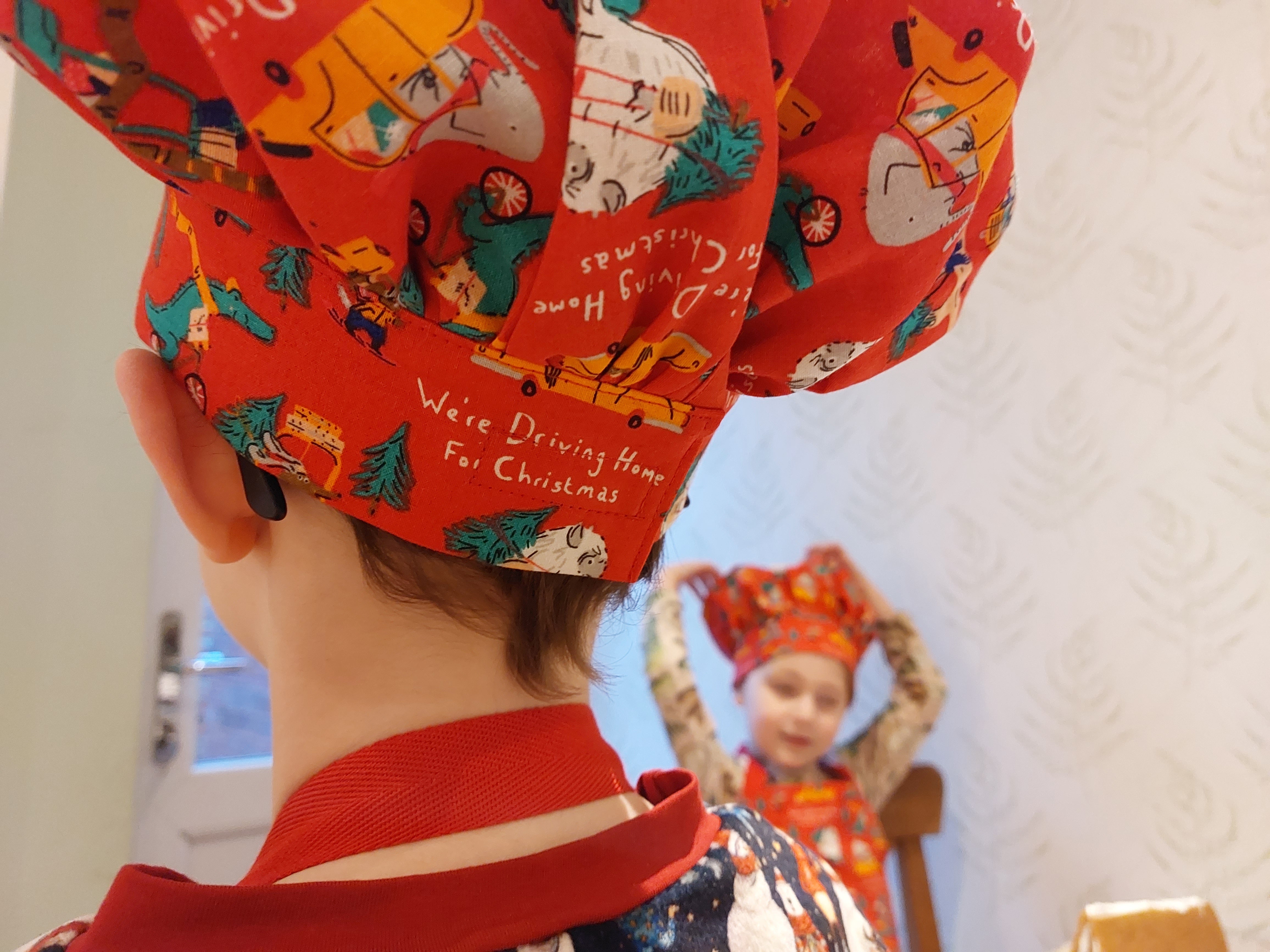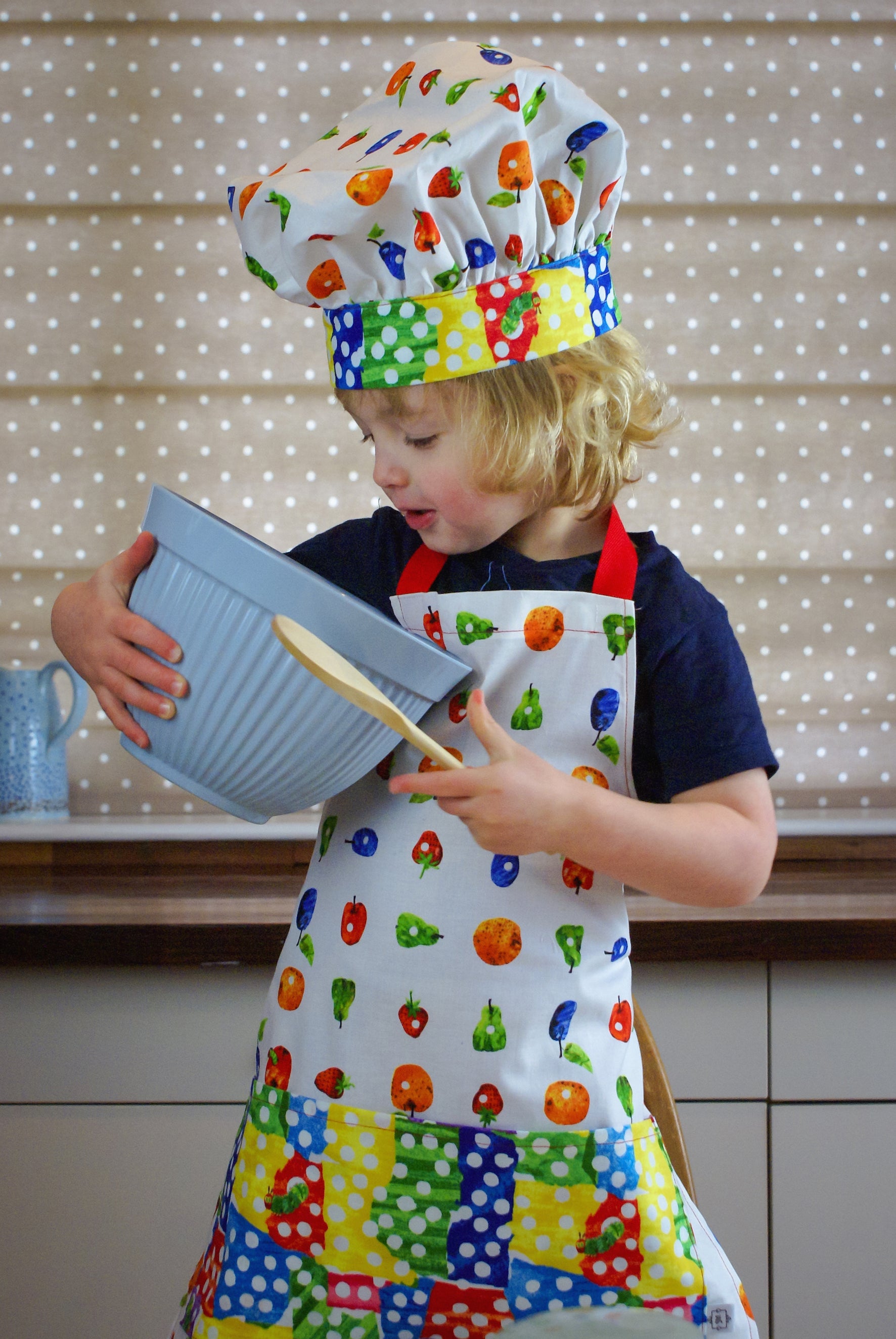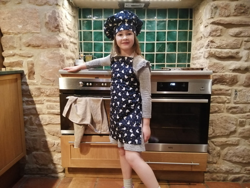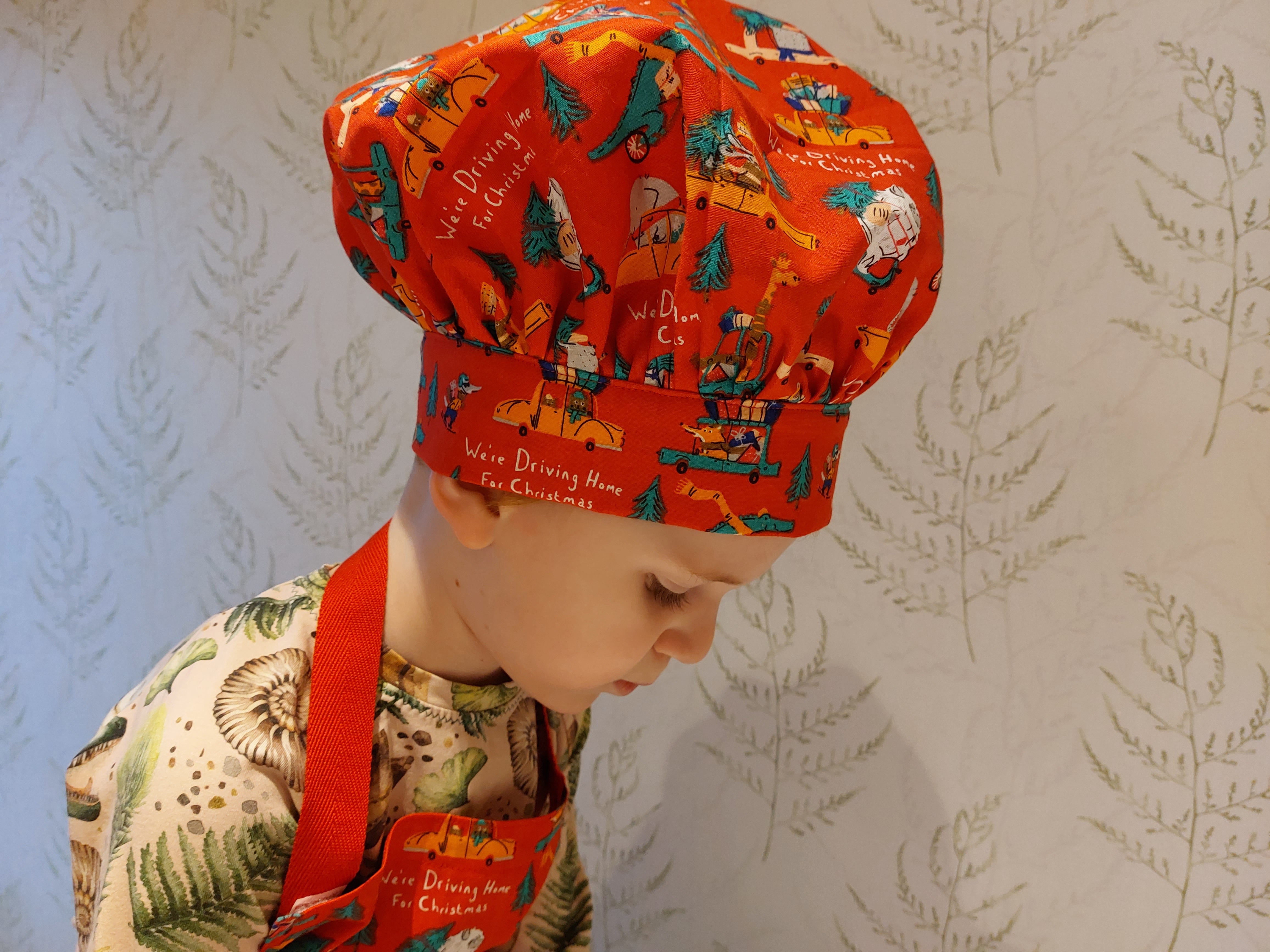 Aaron’s Chef set is an adjustable apron and chef’s hat, designed to fit roughly age 3 – 8. It is designed for woven fabric and suitable for enthusiastic beginners.