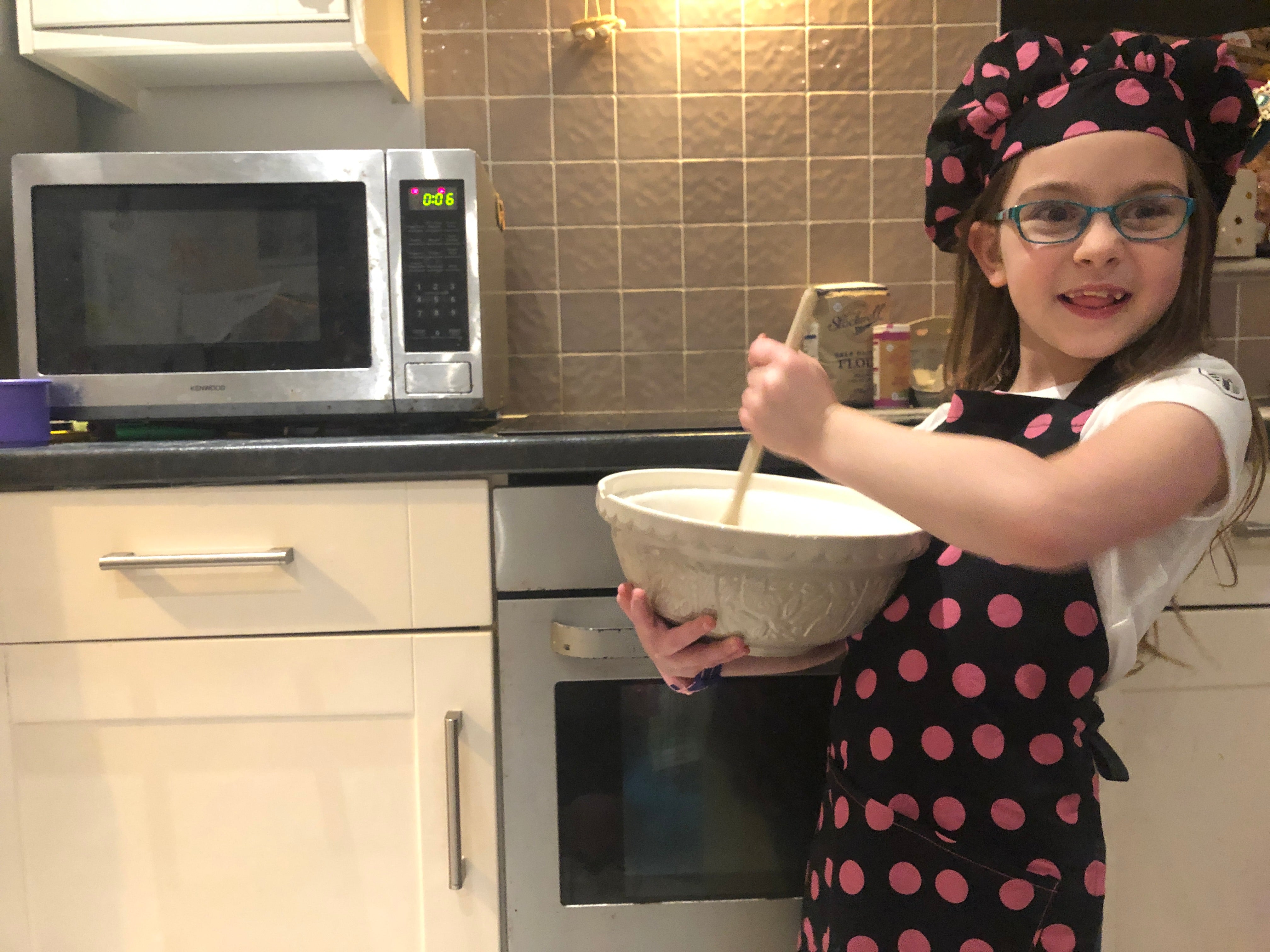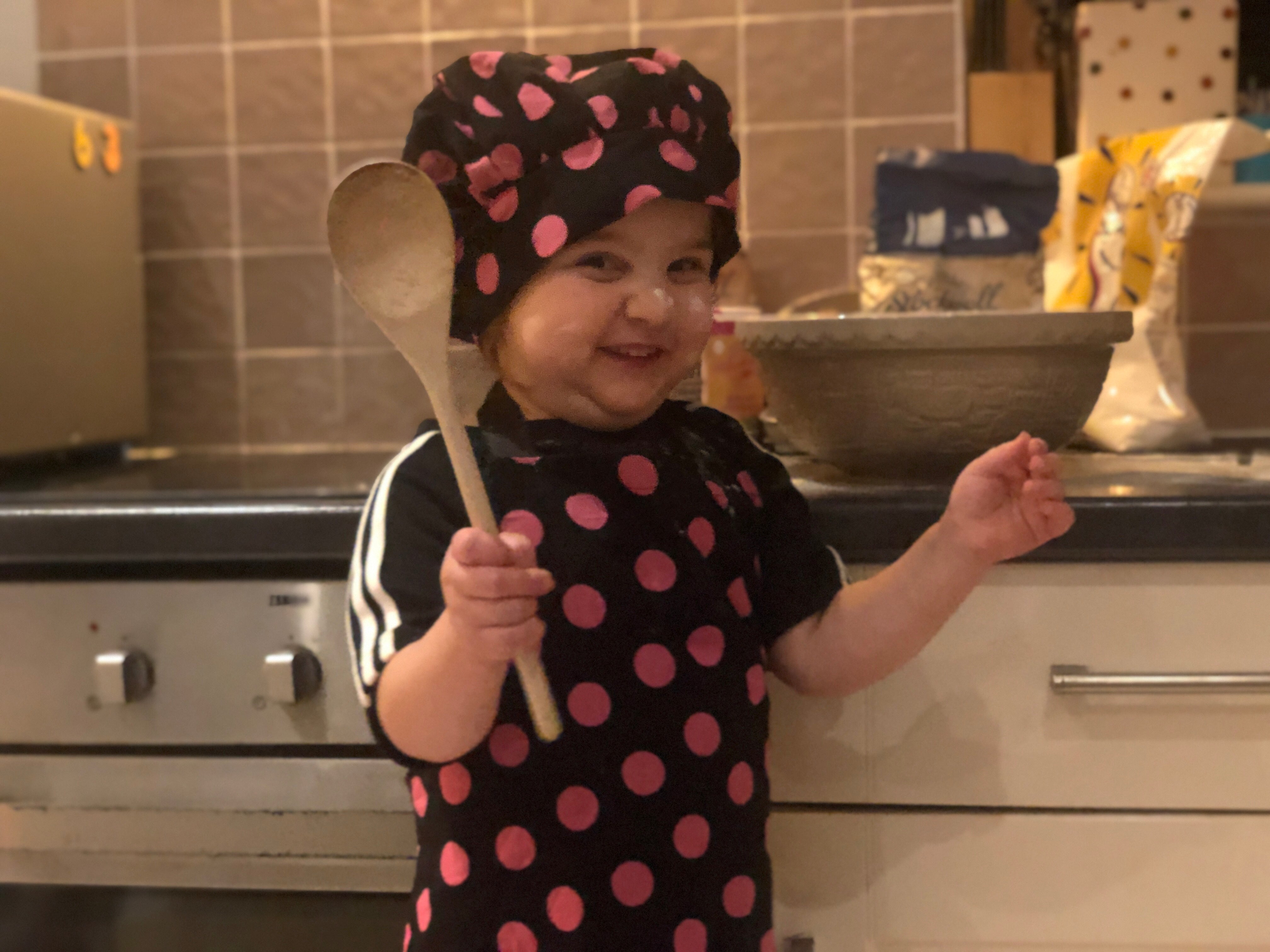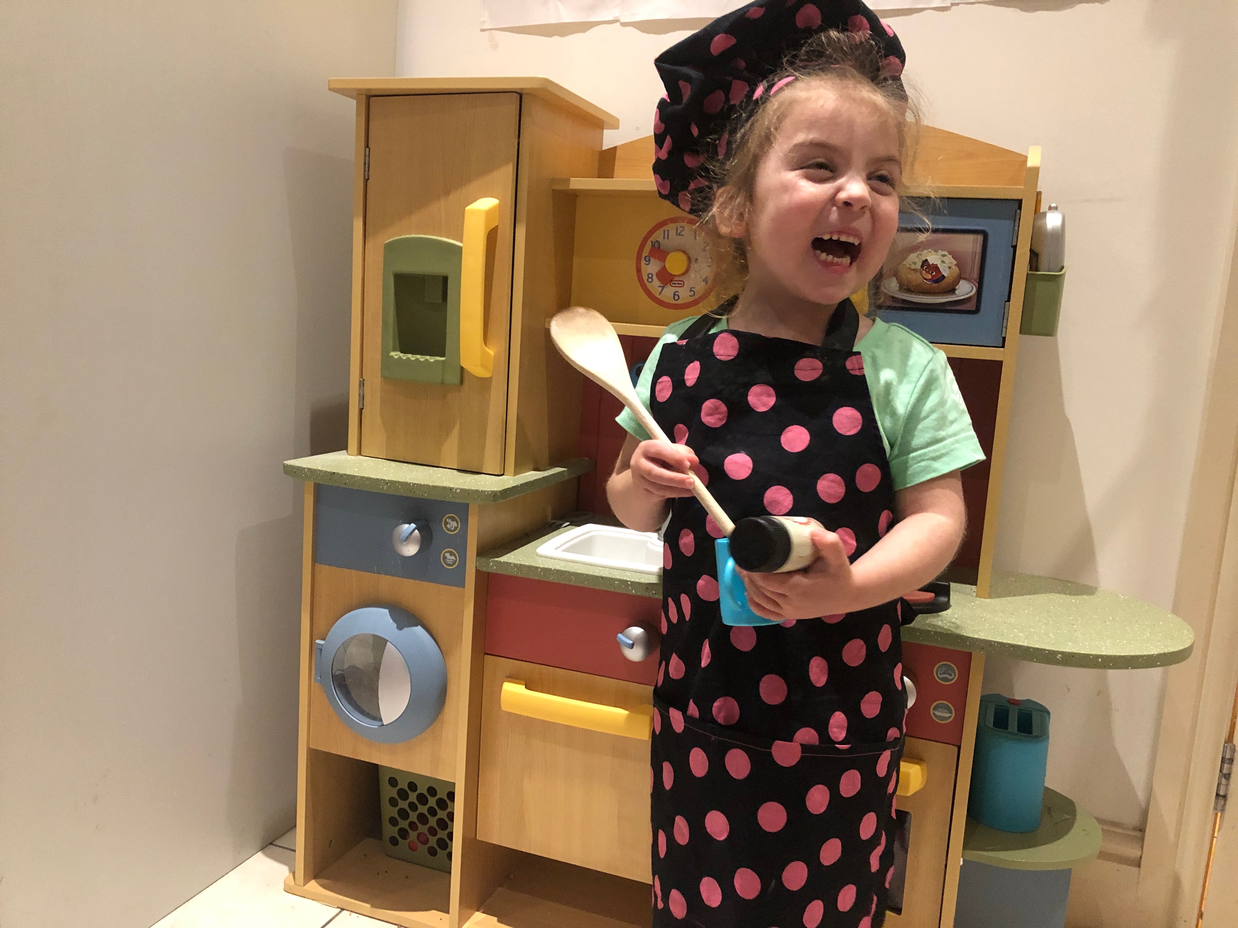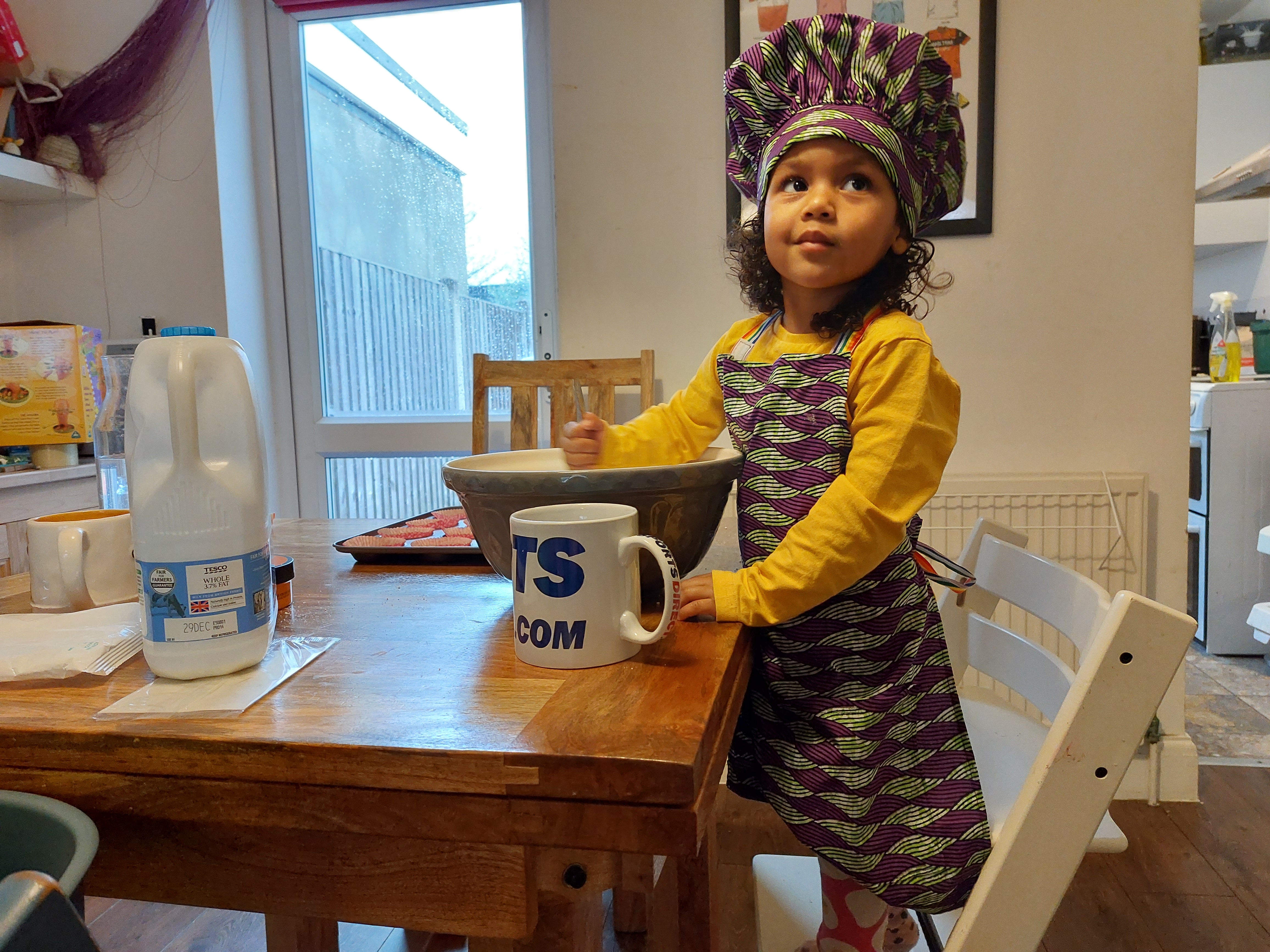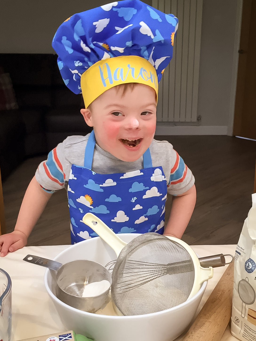 Aaron’s Chef set is an adjustable apron and chef’s hat, designed to fit roughly age 3 – 8. It is designed for woven fabric and suitable for enthusiastic beginners.