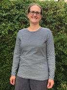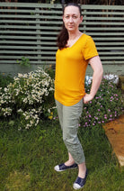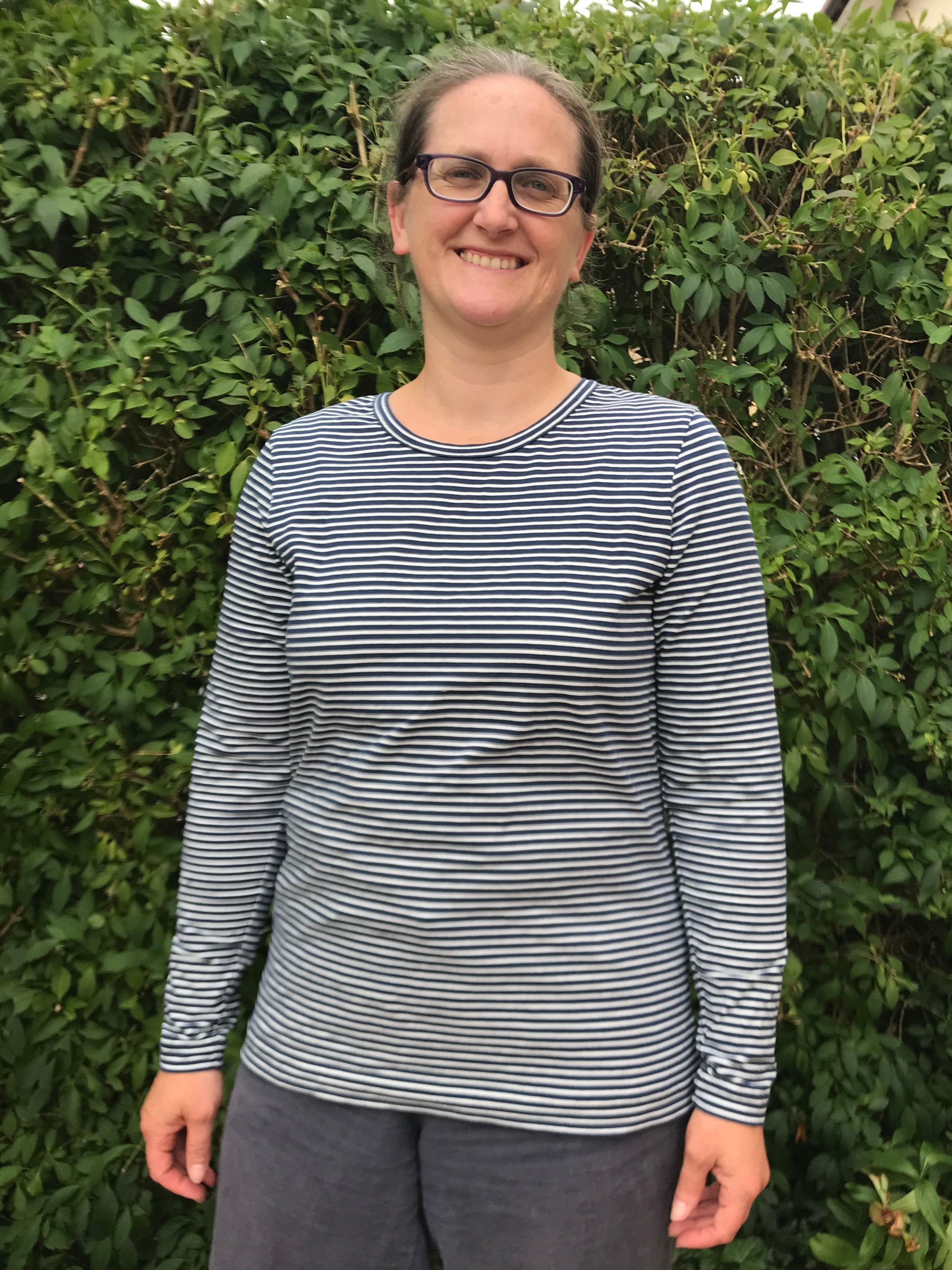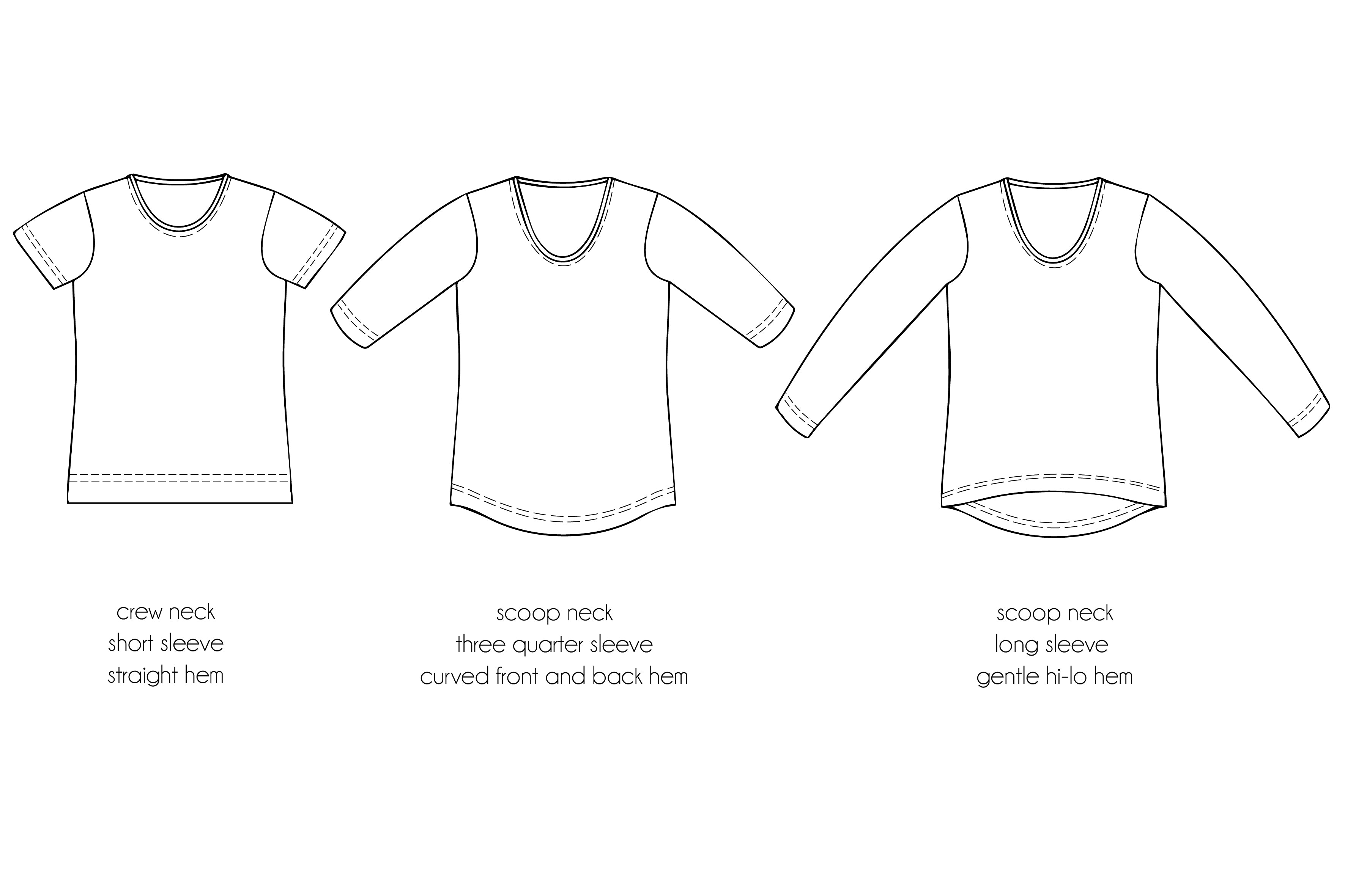 The Cuppa Tee has a relaxed fit with gentle shaping. There are two necklines, three sleeve lengths and three hem options. Additionally, there is a separate pattern piece for those who require a full bust adjustment.