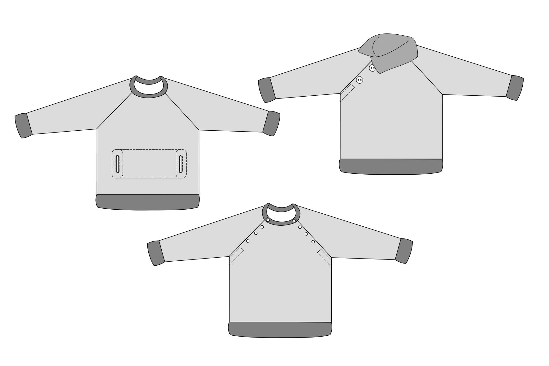 A simple but stylish raglan sweatshirt for children. There are 4 neckline options – regular crew (round) neck, single or double button neck, and split collar button neck. There is also the option for a through pocket.