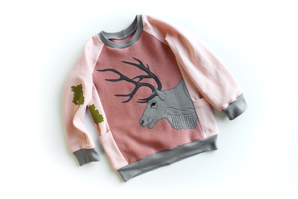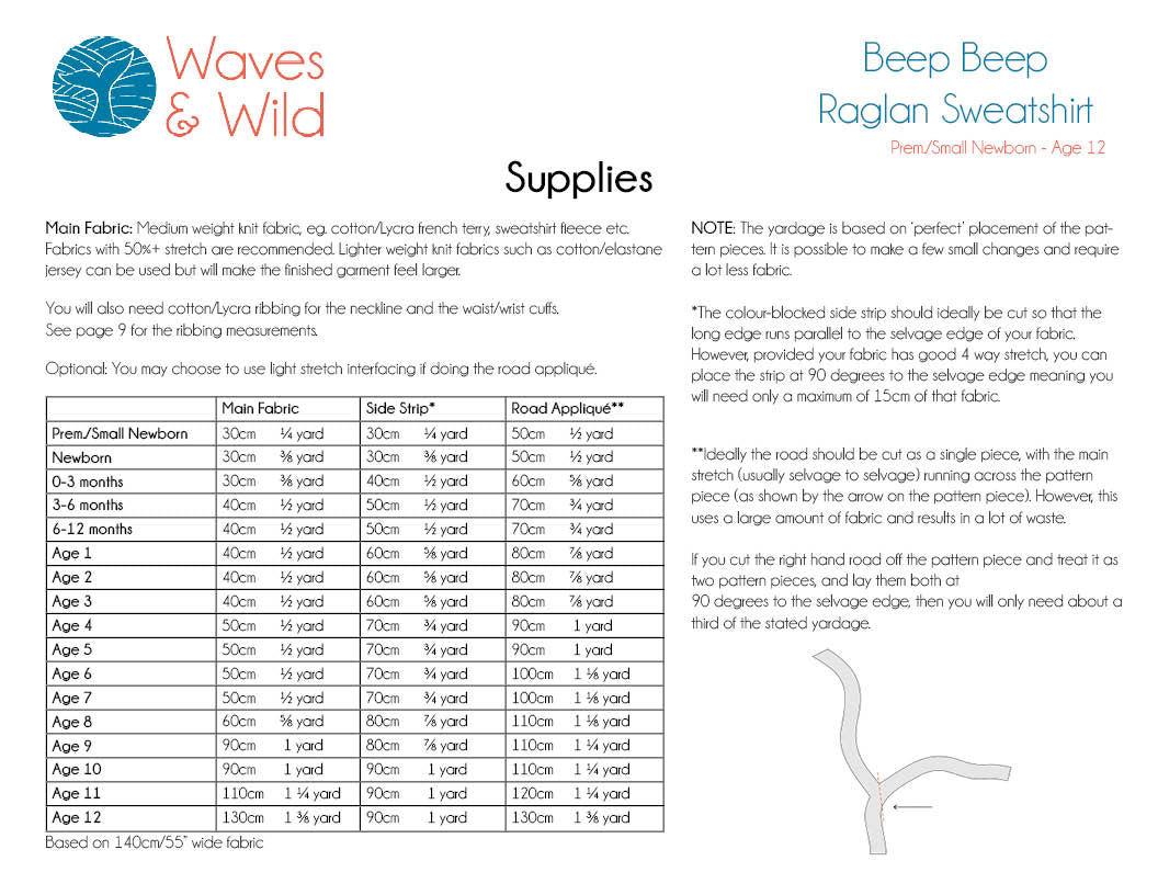 The Beep Beep Ragland Sweatshirt goes from prem./small newborn up to Age 12. Medium weight knit fabrics such as french terry are perfect for this pattern.