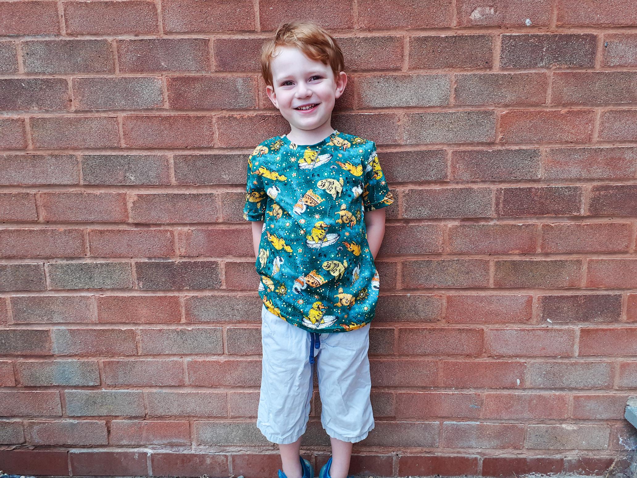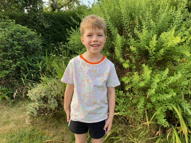 Light/medium weight knit fabrics such as cotton/Lycra jersey are perfect for this child t-shirt sewing pattern.