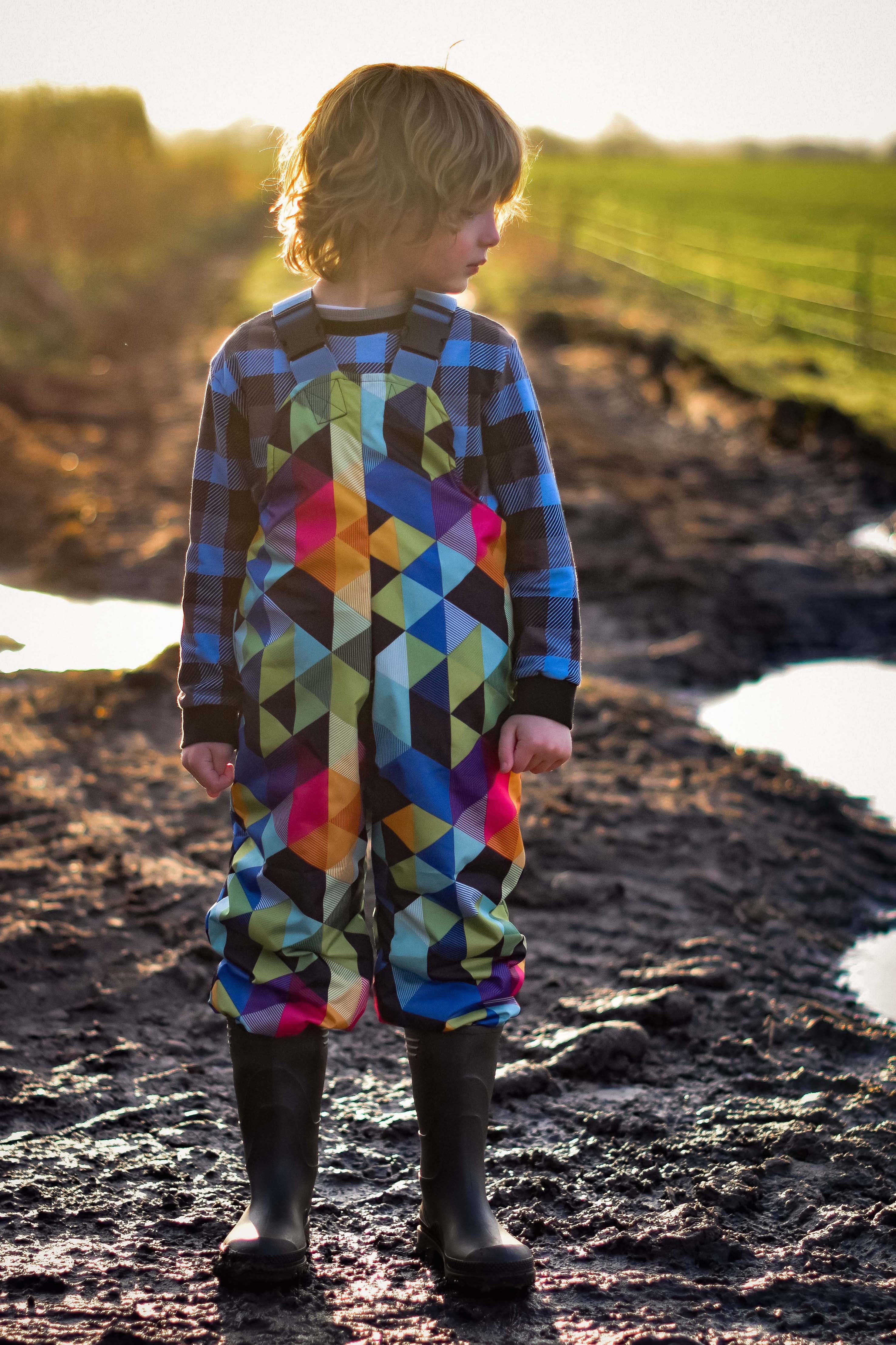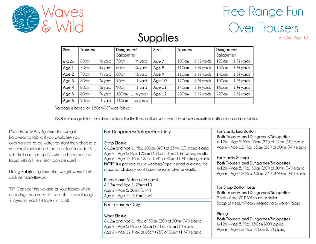 The Free Range Fun Over Trousers pattern goes right from 6-12 months up to age 12. You can choose between trousers or dungarees/salopettes. They can be lined or unlined. Additionally, they can have straight legs, snap legs or elasticated legs (with optional stirrups.)