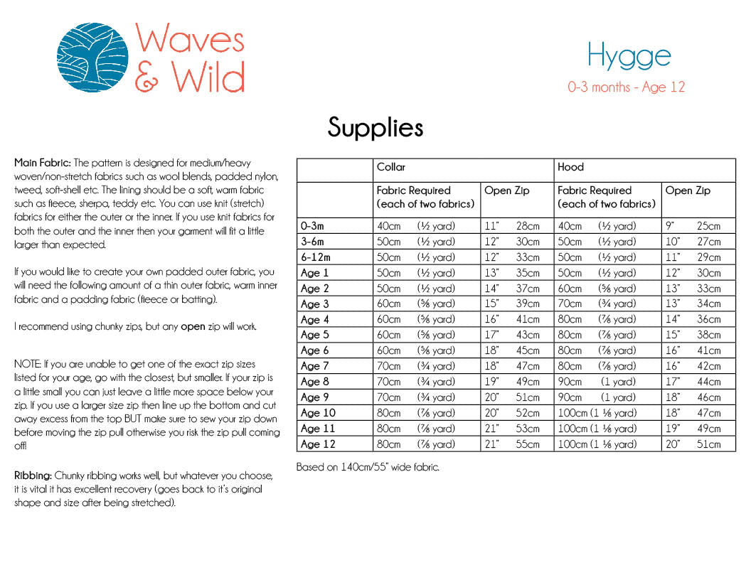 The Hygge goes from 0-3m up to Age 12. It is designed for warm, thick fabrics such as wool blends, soft shell or padded nylon. Warm fabrics such as fleece are ideal for the lining. This is an intermediate level pattern although there are options available for advanced beginners.