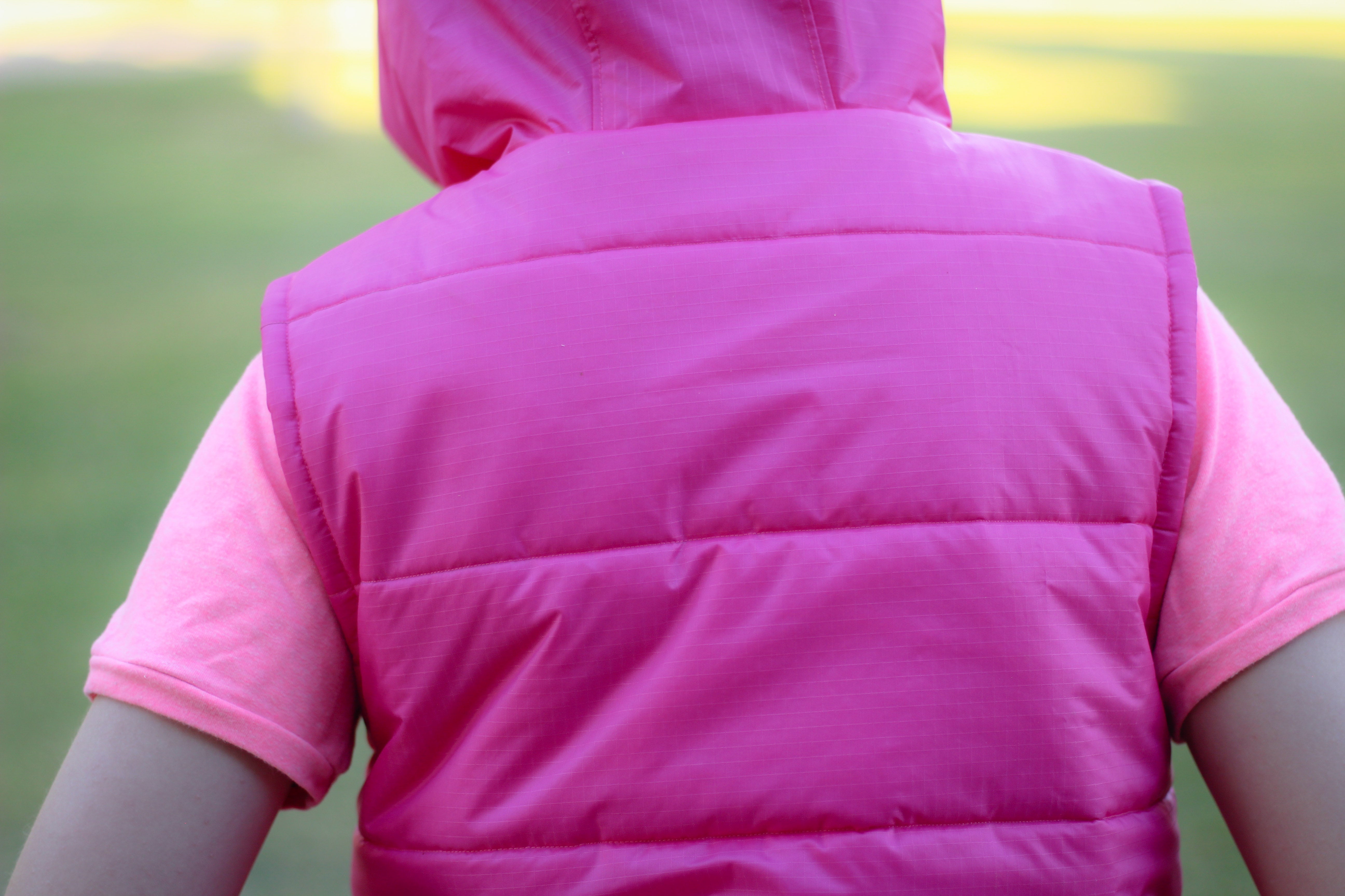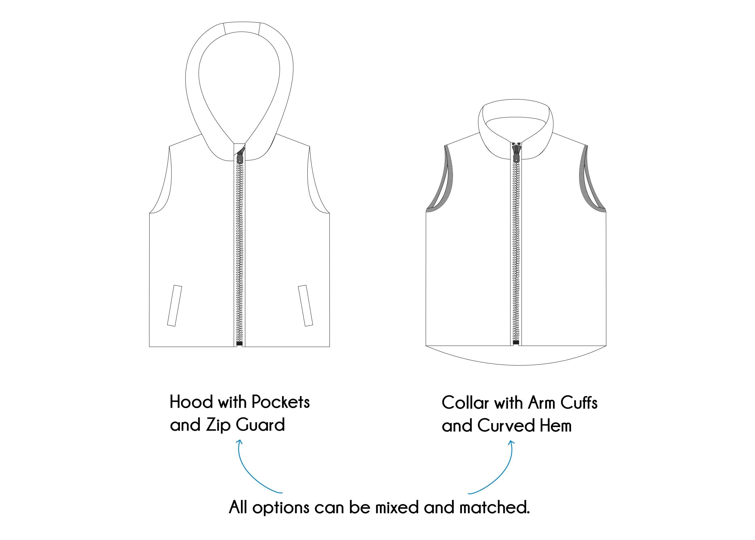The Hygge is a lined, sleeveless, zipped vest/bodywarmer/gilet (depending on where you live!). There are options for a straight or curved back hem, collar or hood, optional welt pockets and optional ribbed arm cuffs and optional zip guard.