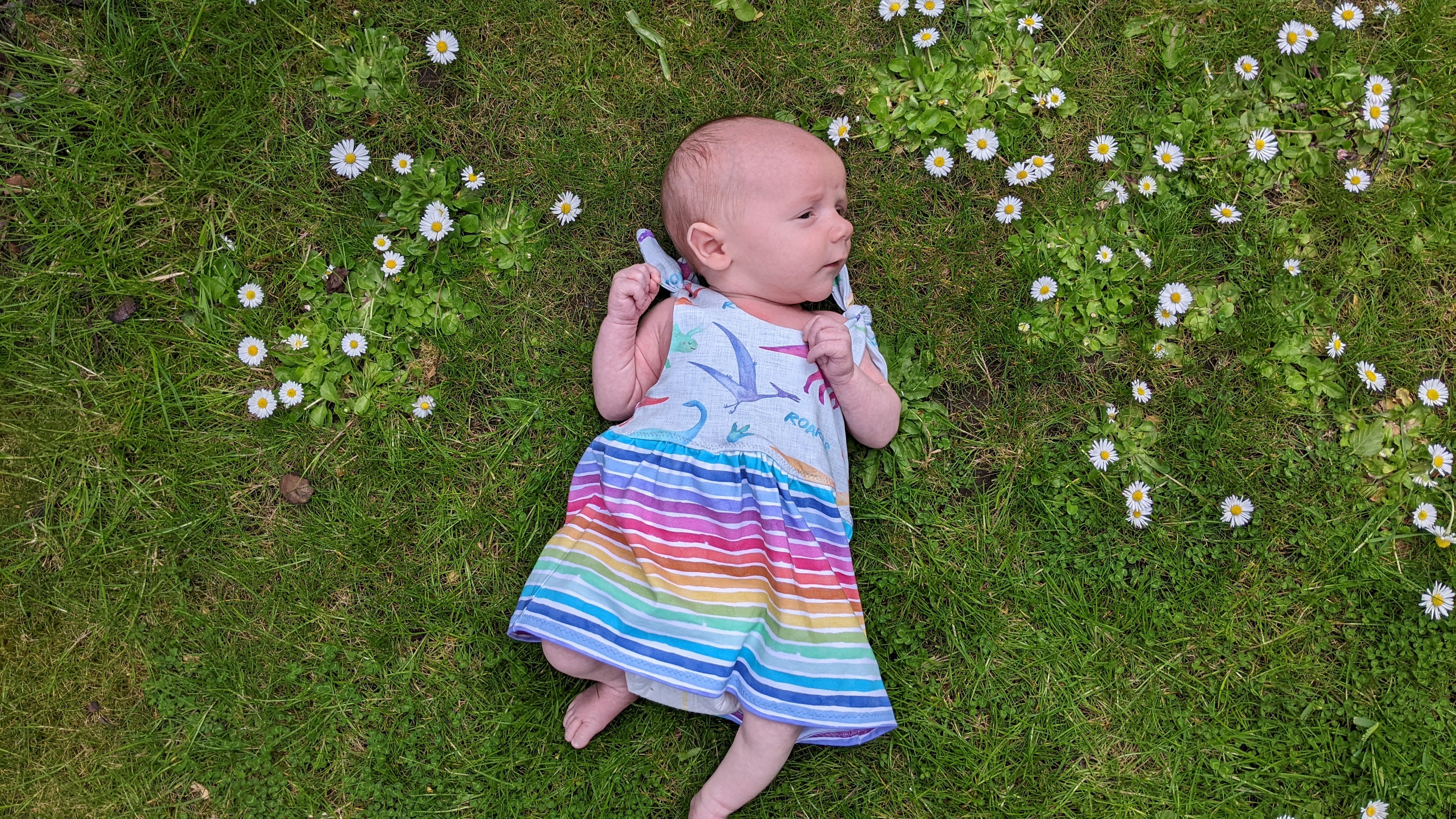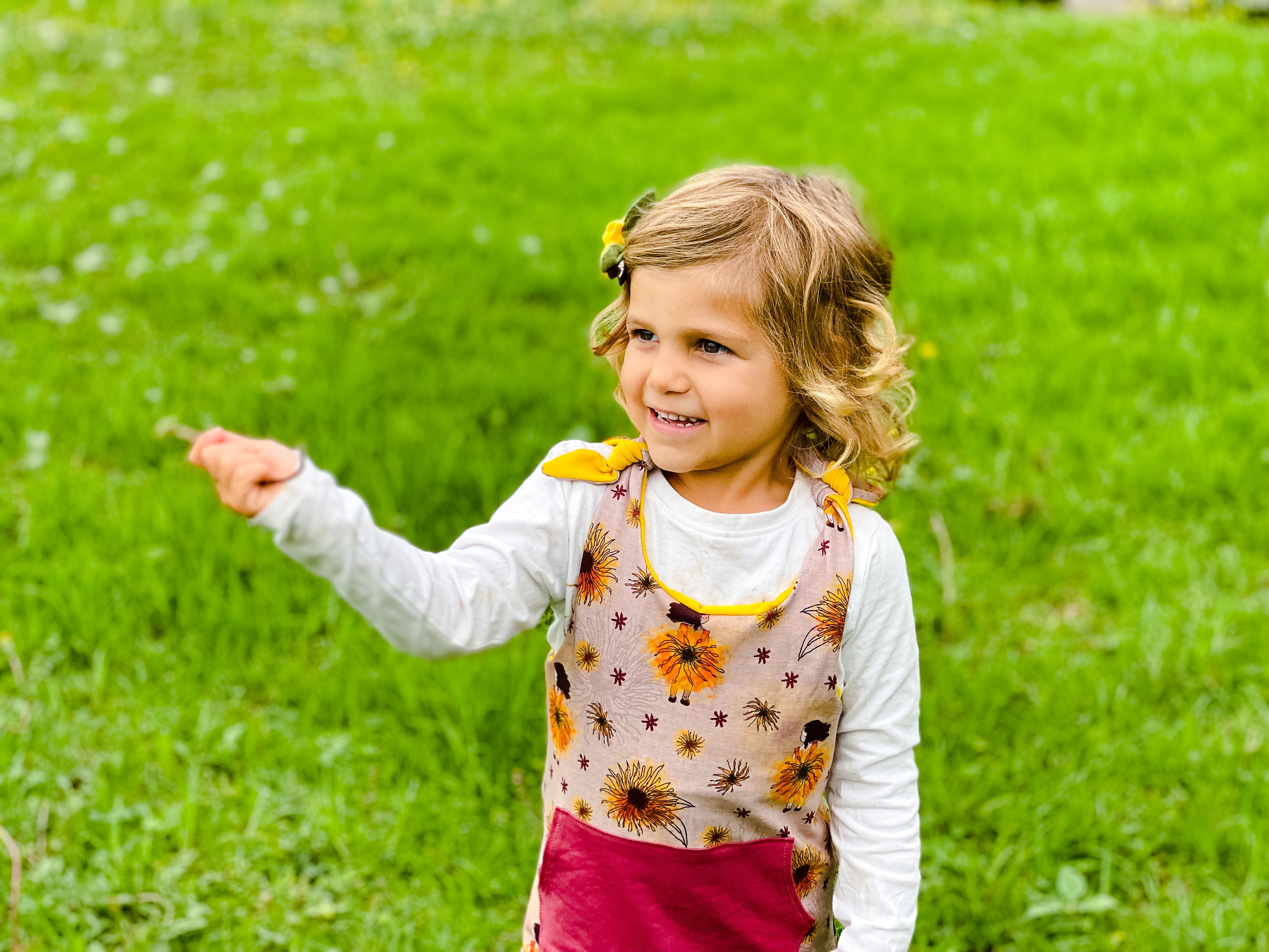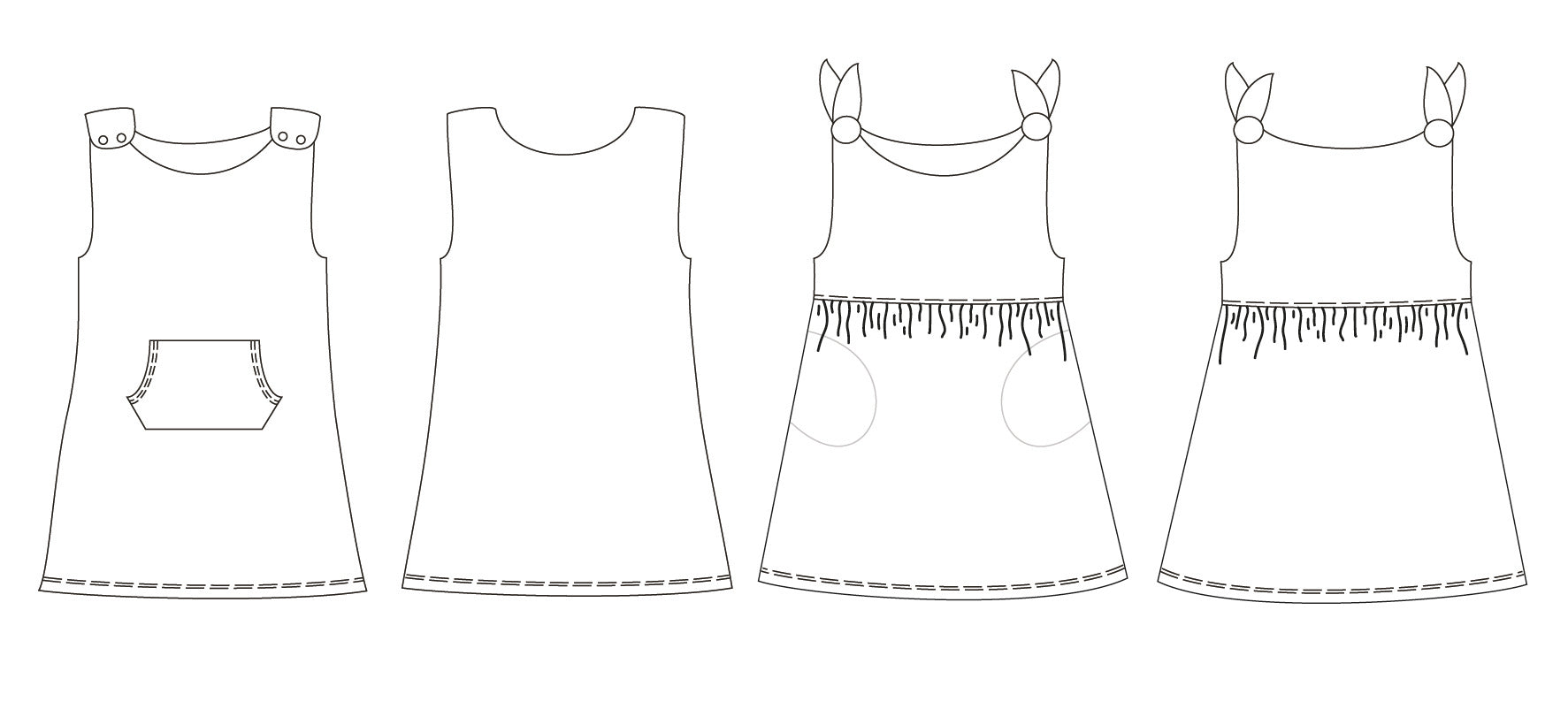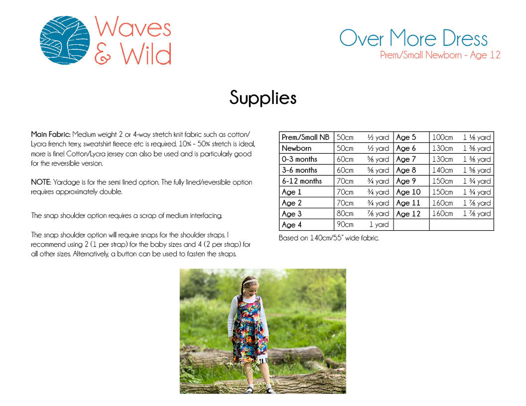 The Over More Dress goes from prem./small NB – Age 12. There is also a coordinating overalls/dungarees pattern called the Over It Alls.