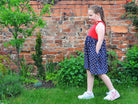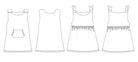 The Over More Dress is designed for light/mid-weight knit fabrics such as cotton/Lycra jersey or French terry. There are two styles of dress, each with their own pocket option – A line with a kanga pocket or gathered skirt with inseam pockets. Both styles can have snap shoulders or tie shoulders. There is also an option to make a fully lined/reversible A line dress.