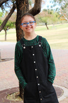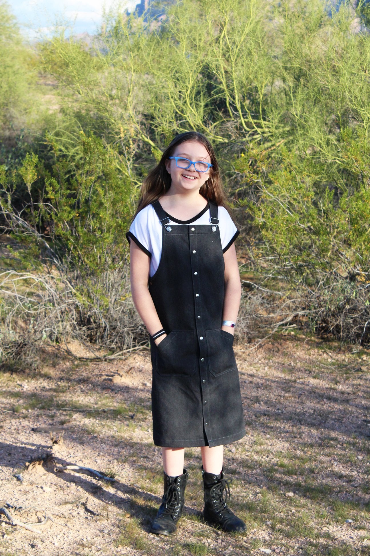 The Penny Pinny is a relaxed pinafore dress. Choose between tie straps (which don’t need undoing in order to take the garment on and off) or traditional buckles. There are FIVE pockets for hiding all your stuff. There are two lengths – mini to sit above the knee and midi to cover the knee. In addition, a back split can be added to both lengths. You can also choose to add a button opening at the hip.
