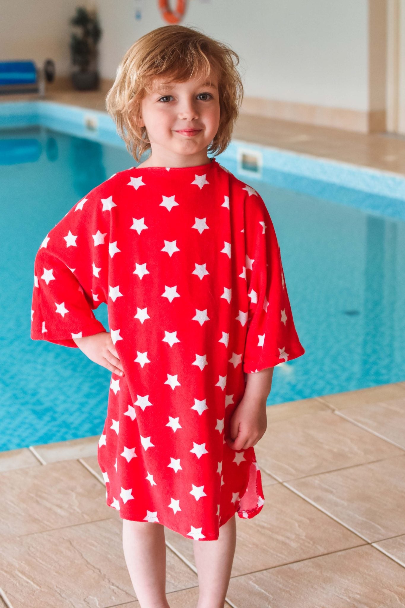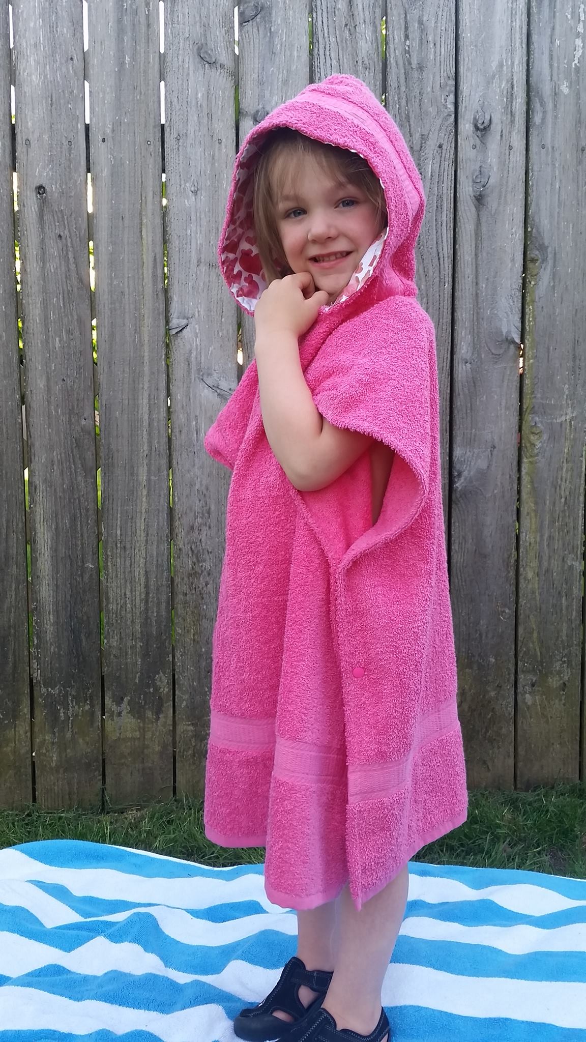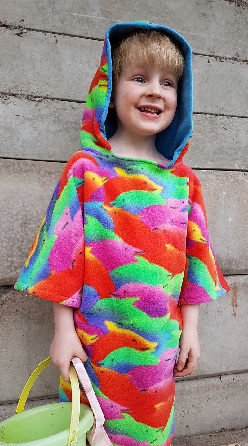 The Pool Cover Up is a hooded poncho style towel, perfect for the pool or beach. There’s a standard hooded poncho with optional side snaps. Additionally there’s a more fitted hooded top with sleeves.