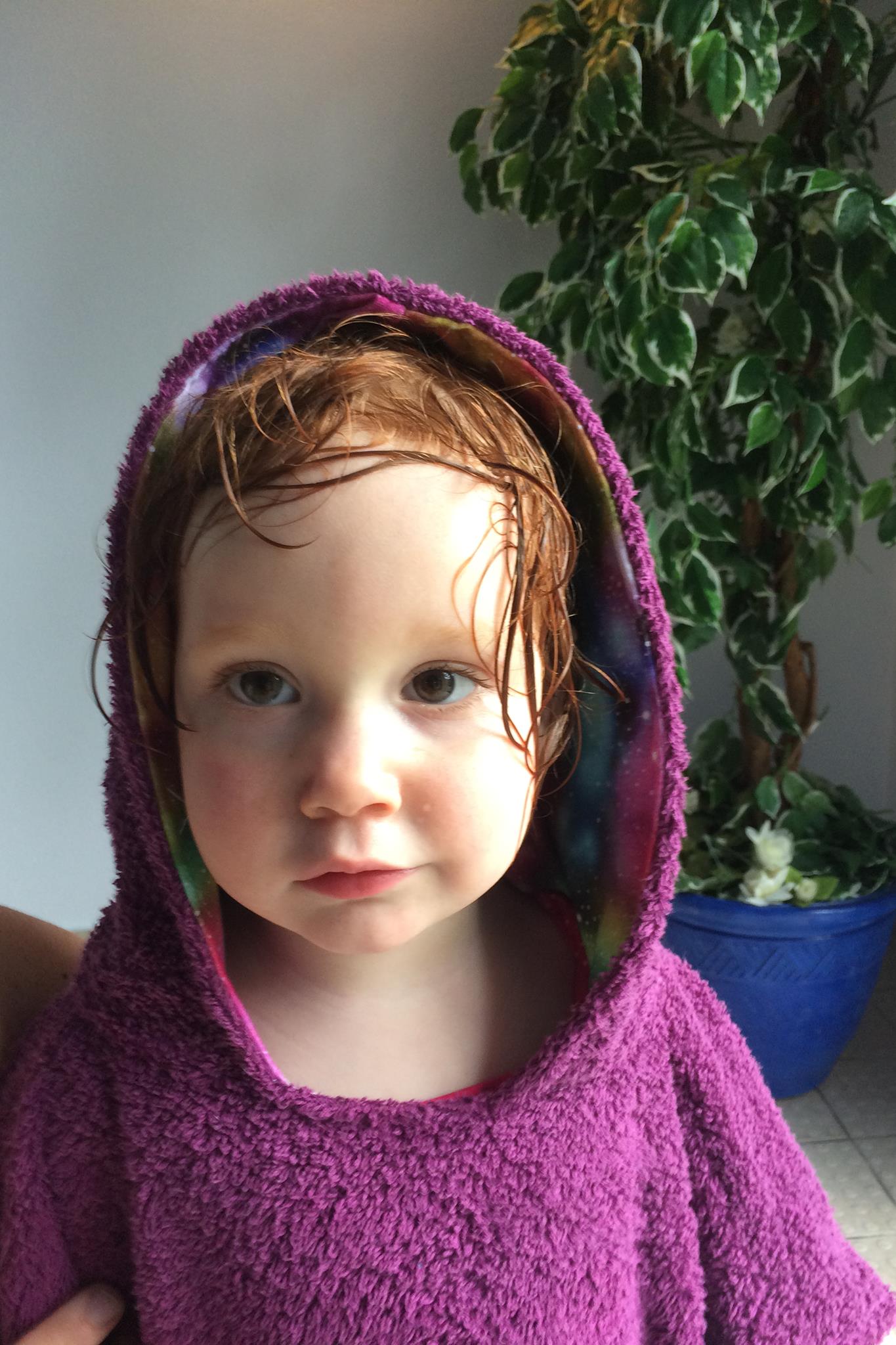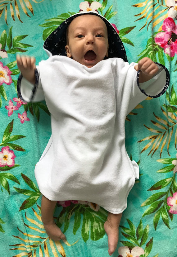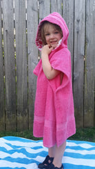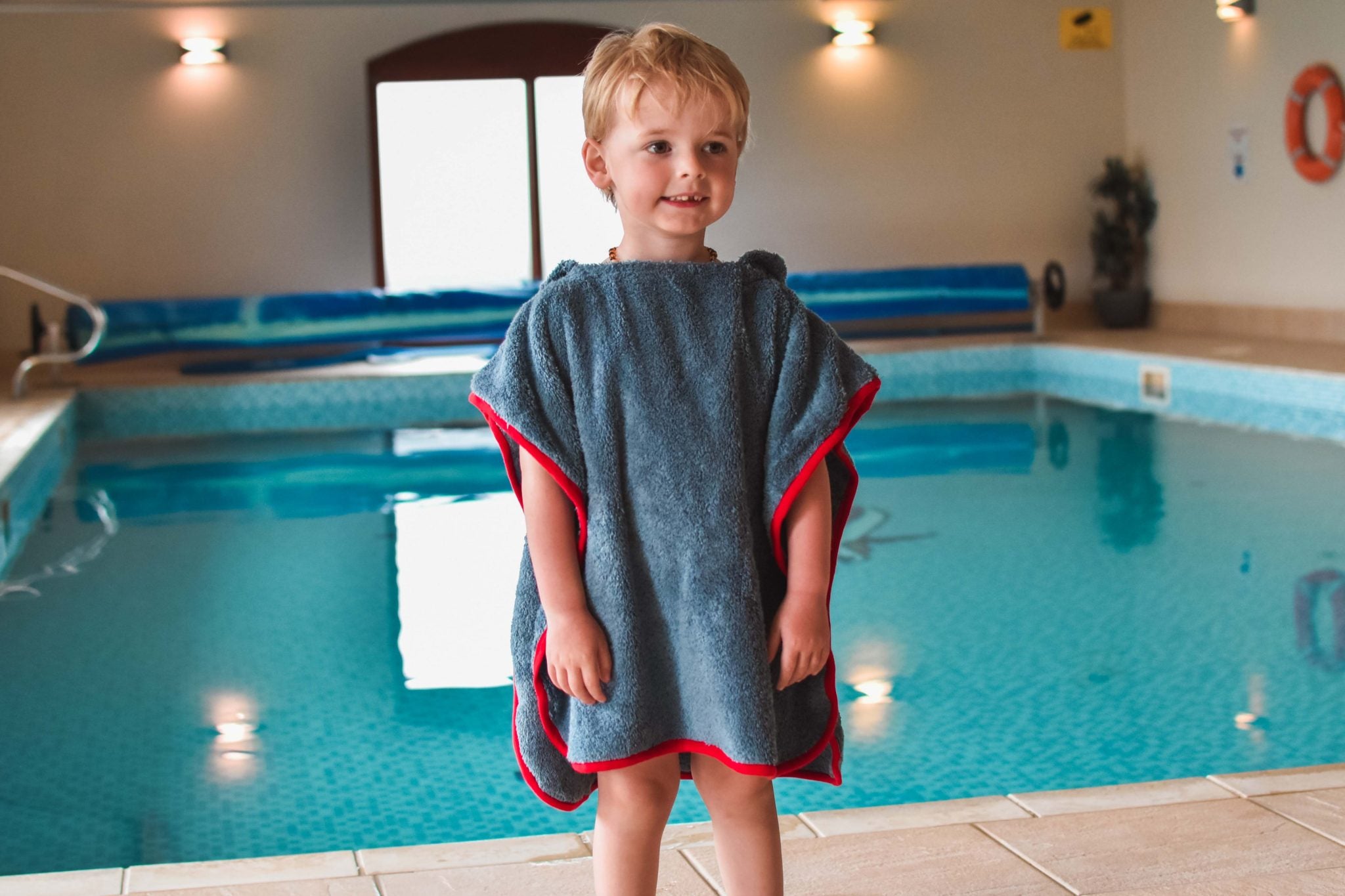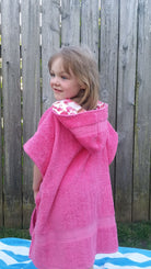 The Pool Cover Up is a hooded poncho style towel, perfect for the pool or beach. There’s a standard hooded poncho with optional side snaps. Additionally there’s a more fitted hooded top with sleeves.