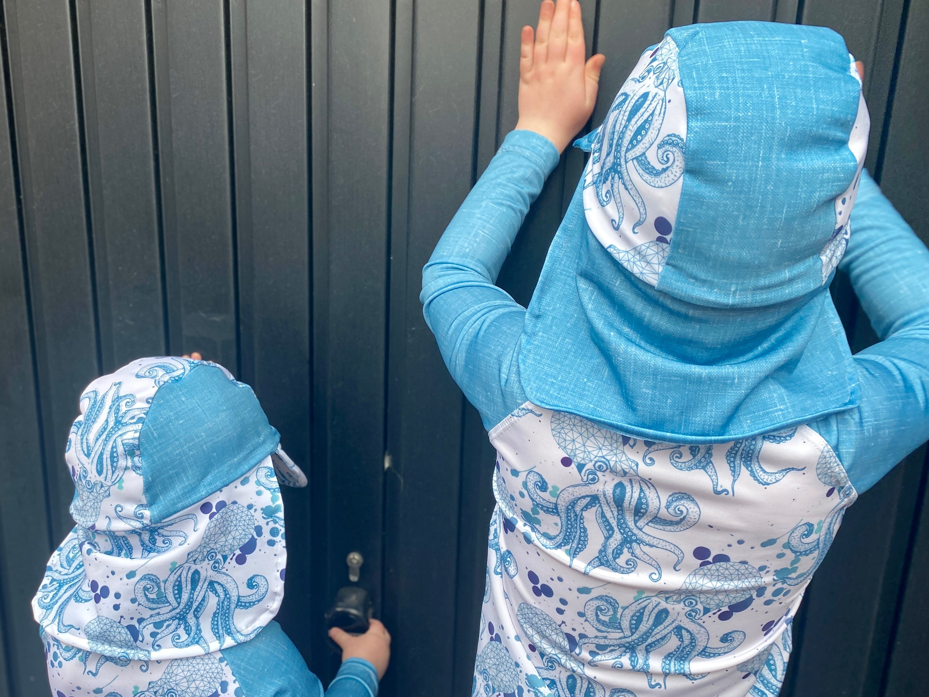 The Pool Party Sun Hat is a soft hat with a peak and neck cover. It is designed to be made from swim Lycra and worn in the water.