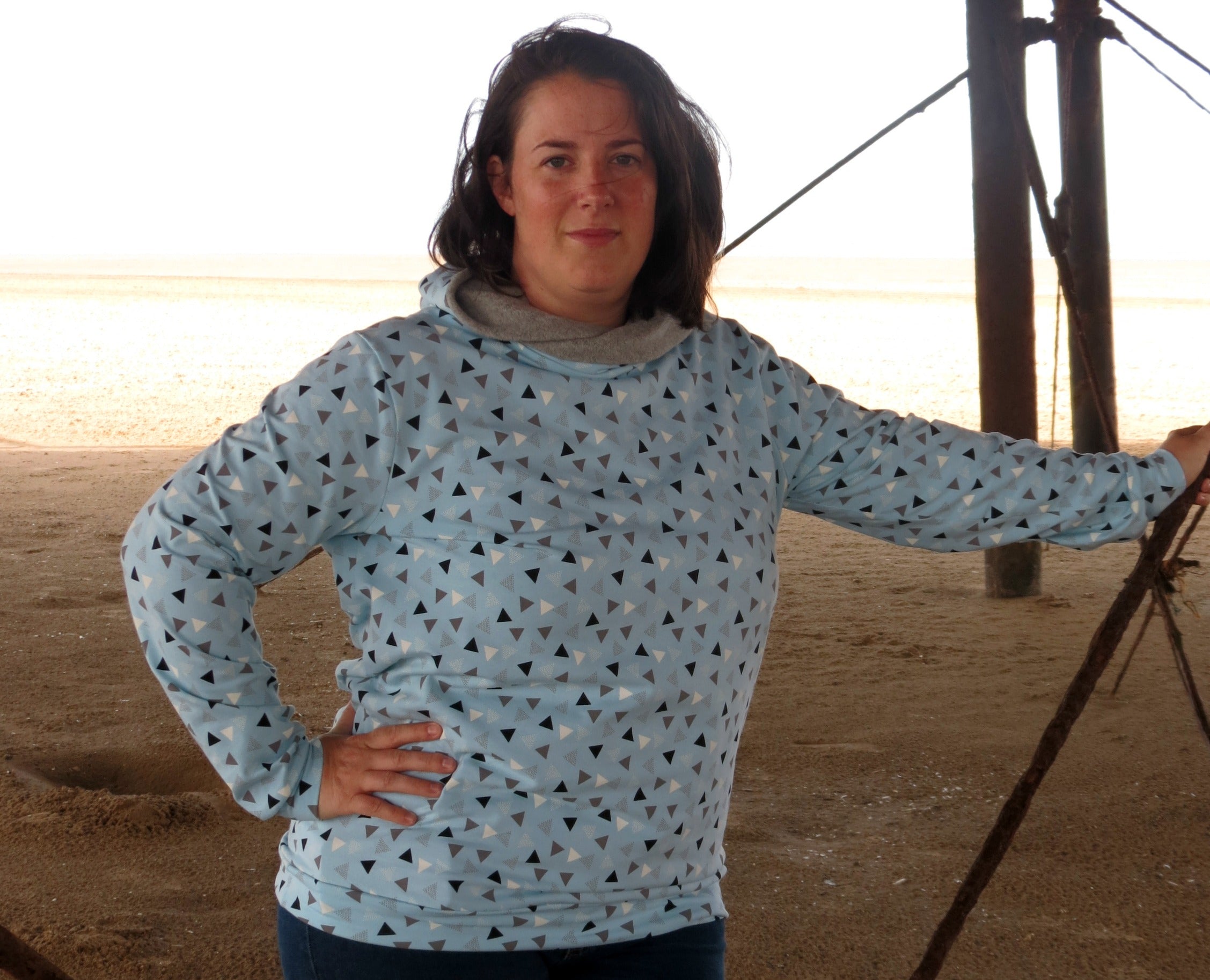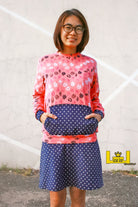 The Hot Coffee Sweatshirt is the perfect cool weather addition to your sewing collection. Choose between three neckline options: crew (round) neck, cowl neck and hoodie. In addition, there are two pocket options: patch pockets and kanga pouch. Finally, add to that the two different lengths for the top and dress and you have a huge number of combinations! It has a slouchy, relaxed fit compared to other Waves and Wild sweatshirt patterns.