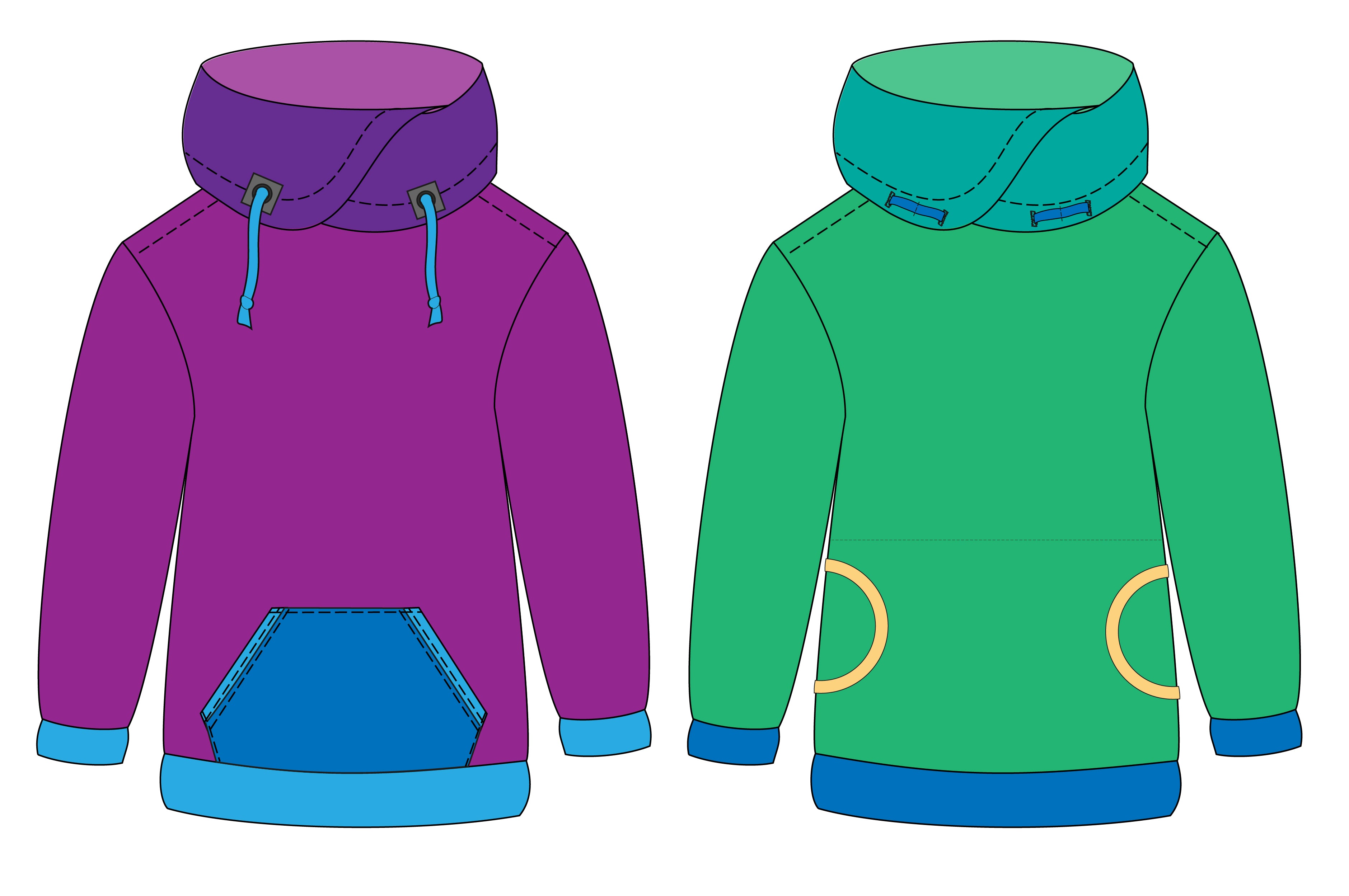 It has a relaxed fit. Choose between a kanga patch pocket, semi-circle through pockets or no pockets! Additionally there is also an option for a faux or functional drawstring detail.
