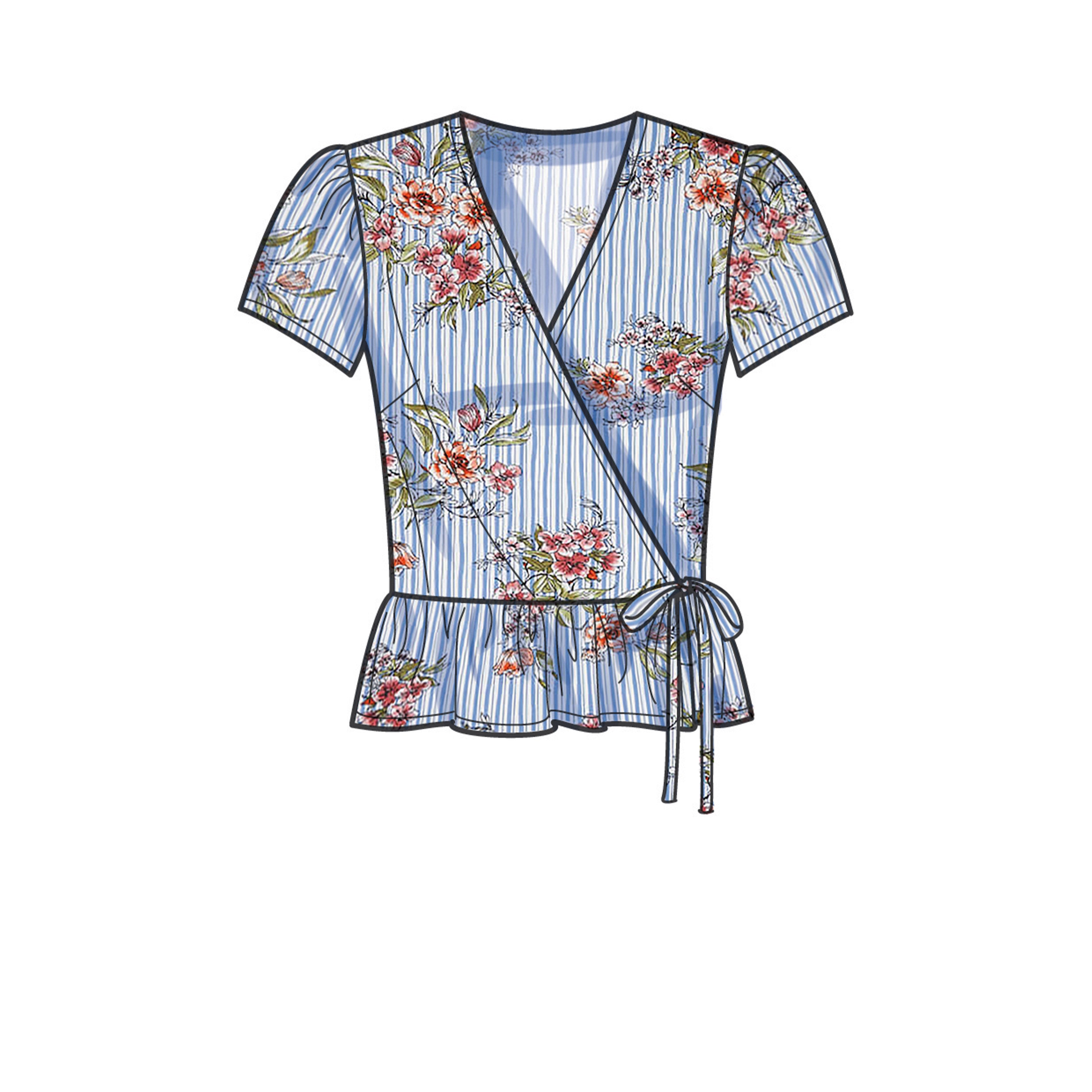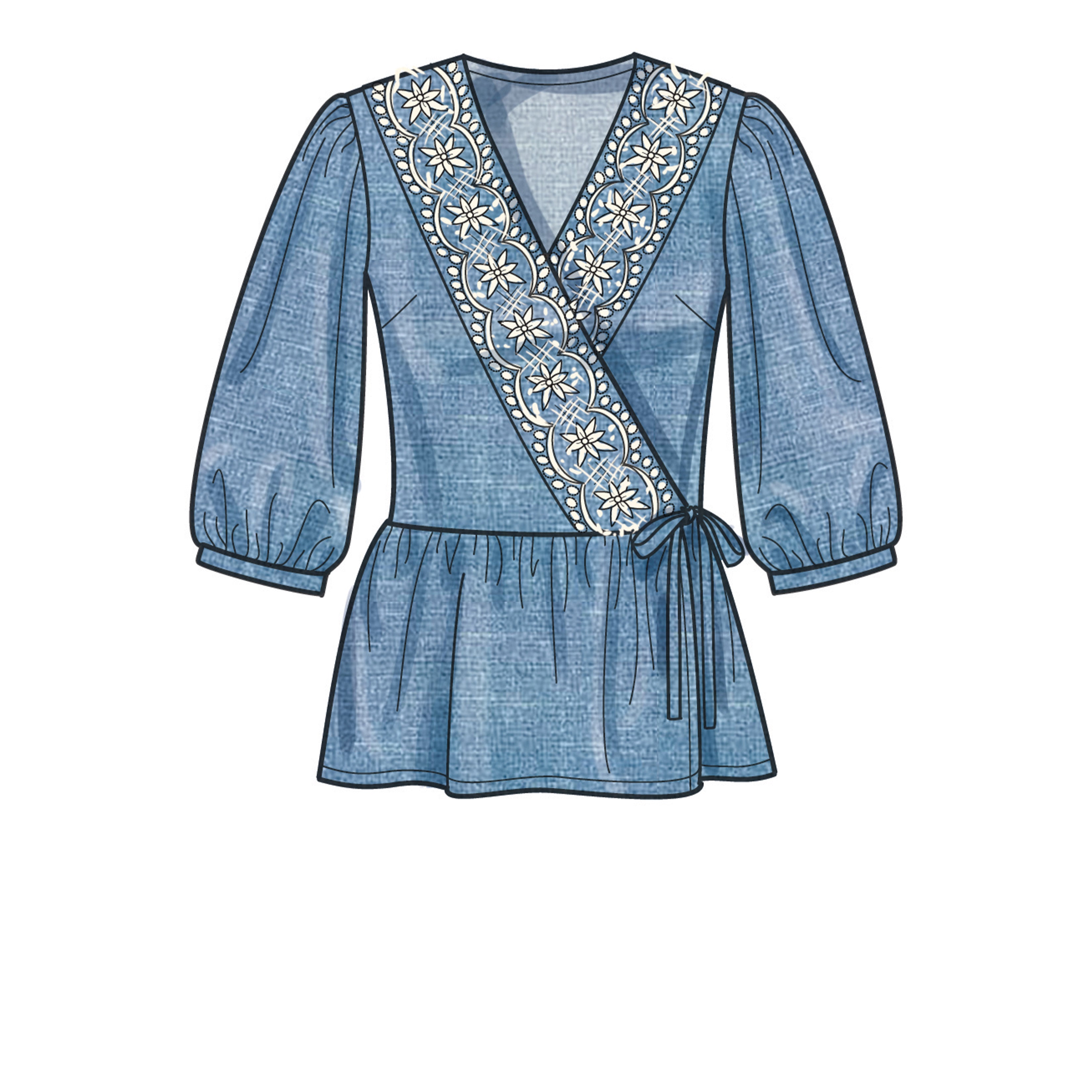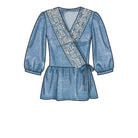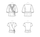 Wrap top with optional lace trim and three-quarter puffed sleeves has hip length peplum gathered to waistline seam with self ties. Second option includes cap sleeves, self ties and short peplum that stops at the high hip.