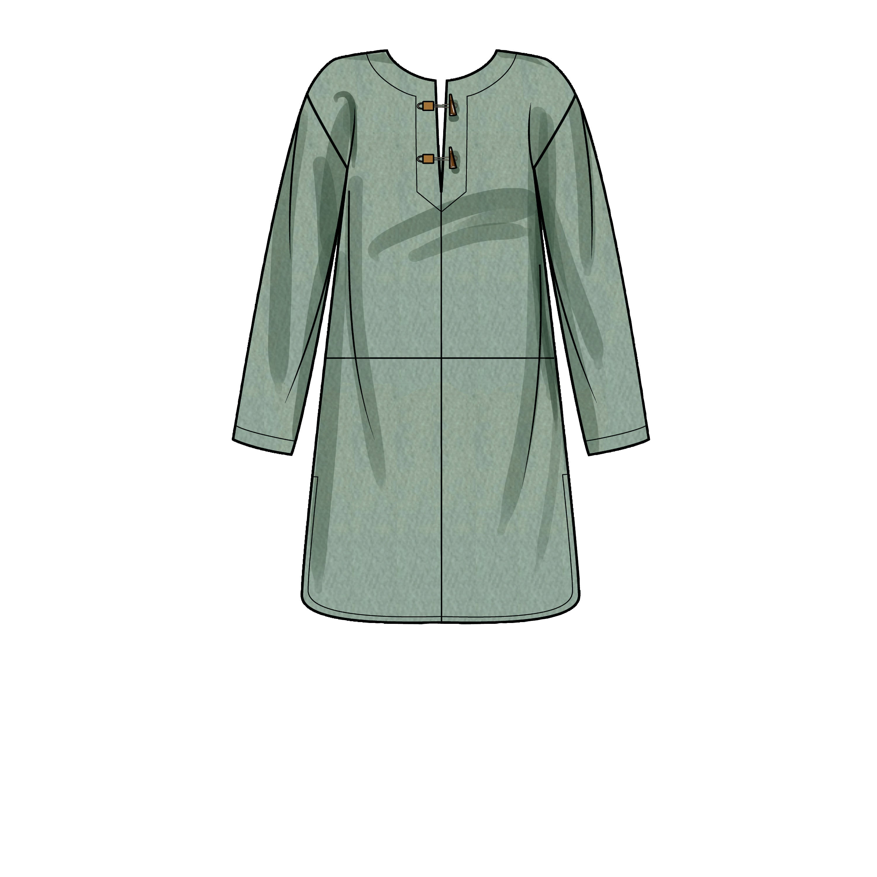Over-the-head poncho with hood or without, has side seam pockets, optional decorative topstitching on front seams and curved hemline open at side seams. Variations include front opening with toggle closures.