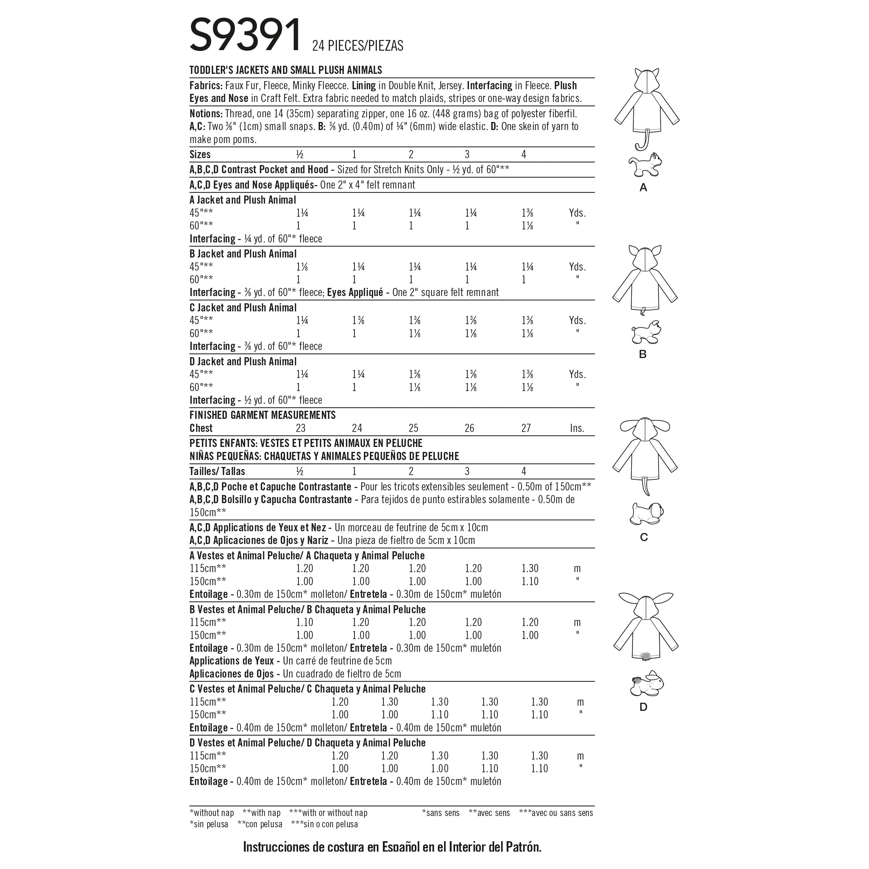 Simplicity Sewing Pattern S9391 - Toddlers' Jackets and Small Plush Animals